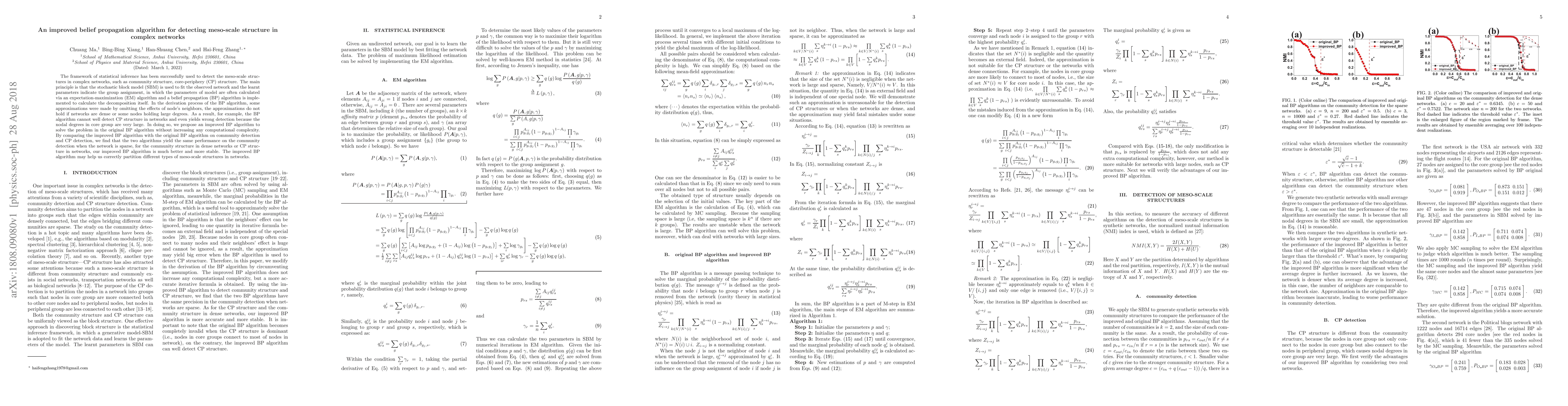 The framework of statistical inference has been successfully used to detect the meso-scale structures in complex networks, such as community structure, core-periphery (CP) structure. The main principle is that the stochastic block model (SBM) is used to fit the observed network and the learnt parameters indicate the group assignment, in which the parameters of model are often calculated via an expectation-maximization (EM) algorithm and a belief propagation (BP) algorithm is implemented to calculate the decomposition itself. In the derivation process of the BP algorithm, some approximations were made by omitting the effects of node's neighbors, the approximations do not hold if networks are dense or some nodes holding large degrees. As a result, for example, the BP algorithm cannot well detect CP structure in networks and even yields wrong detection because the nodal degrees in core group are very large. In doing so, we propose an improved BP algorithm to solve the problem in the original BP algorithm without increasing any computational complexity. By comparing the improved BP algorithm with the original BP algorithm on community detection and CP detection, we find that the two algorithms yield the same performance on the community detection when the network is sparse, for the community structure in dense networks or CP structure in networks, our improved BP algorithm is much better and more stable. The improved BP algorithm may help us correctly partition different types of meso-scale structures in networks.