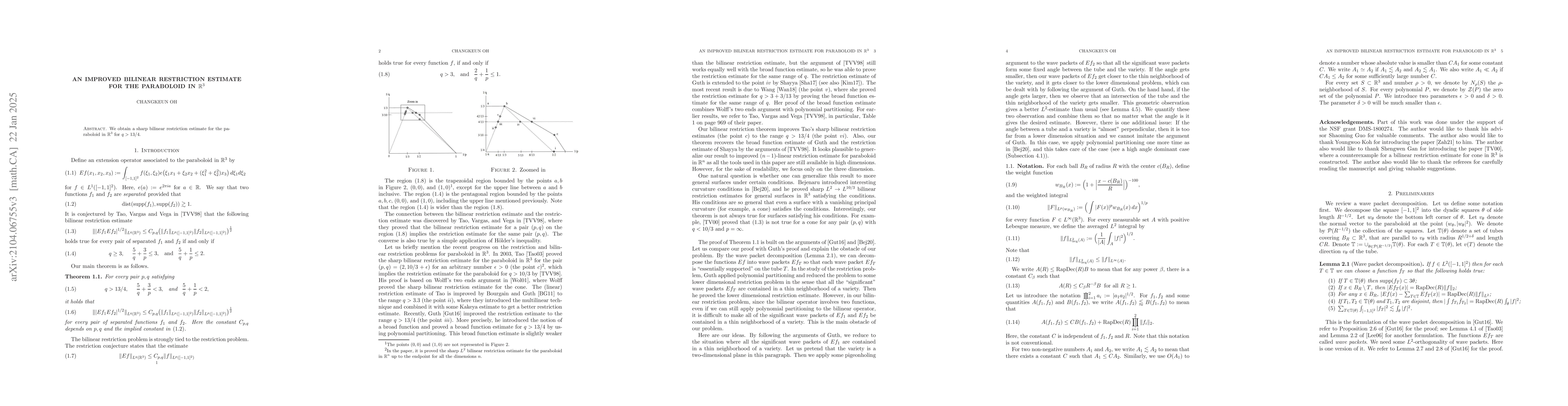 Summary: This paper presents a sharp bilinear restriction estimate for the paraboloid in $\mathbb{R}^3$ when $q > 3.25$, improving upon previous methods and providing a significant advancement in the understanding of such estimates.