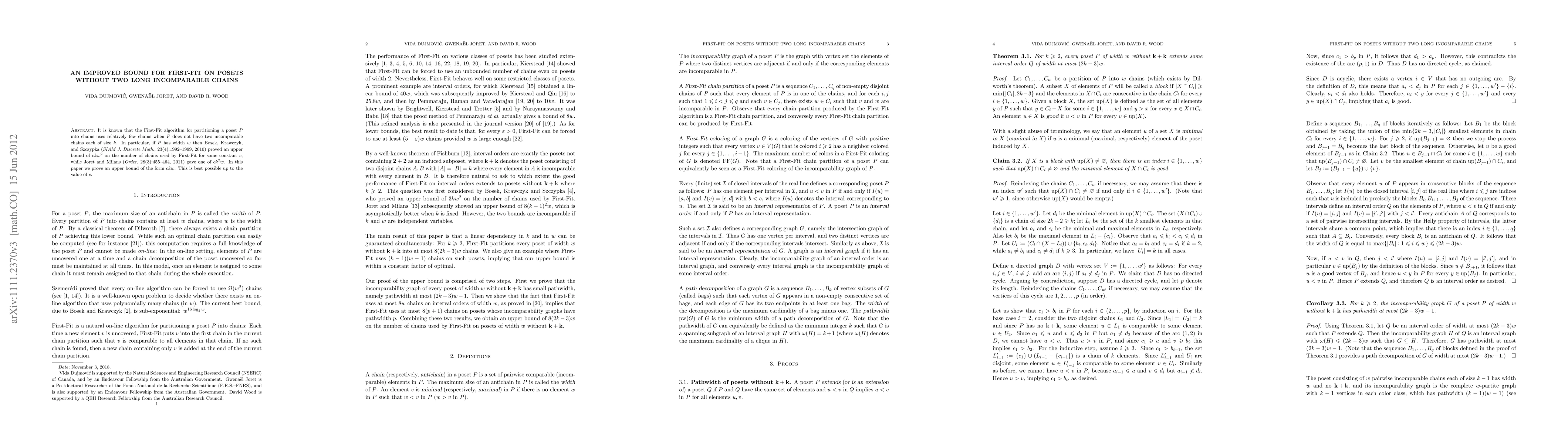 This paper presents an improved upper bound for the First-Fit algorithm on posets without two long incomparable chains, proving that the number of chains used is bounded by ckw, where c is a constant, and k and w represent certain parameters of the poset. This bound is shown to be optimal up to the value of c.