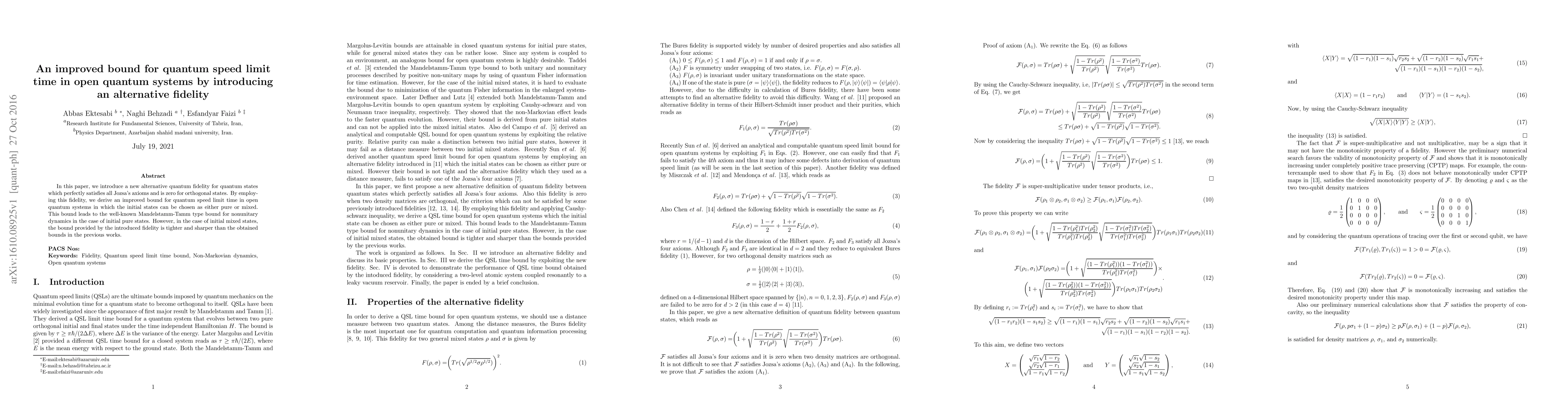 This paper introduces a new quantum fidelity that adheres to all Jozsas axioms and is zero for orthogonal states. It uses this fidelity to derive an improved bound for quantum speed limit time in open quantum systems, providing a tighter bound for initial mixed states compared to previous works.