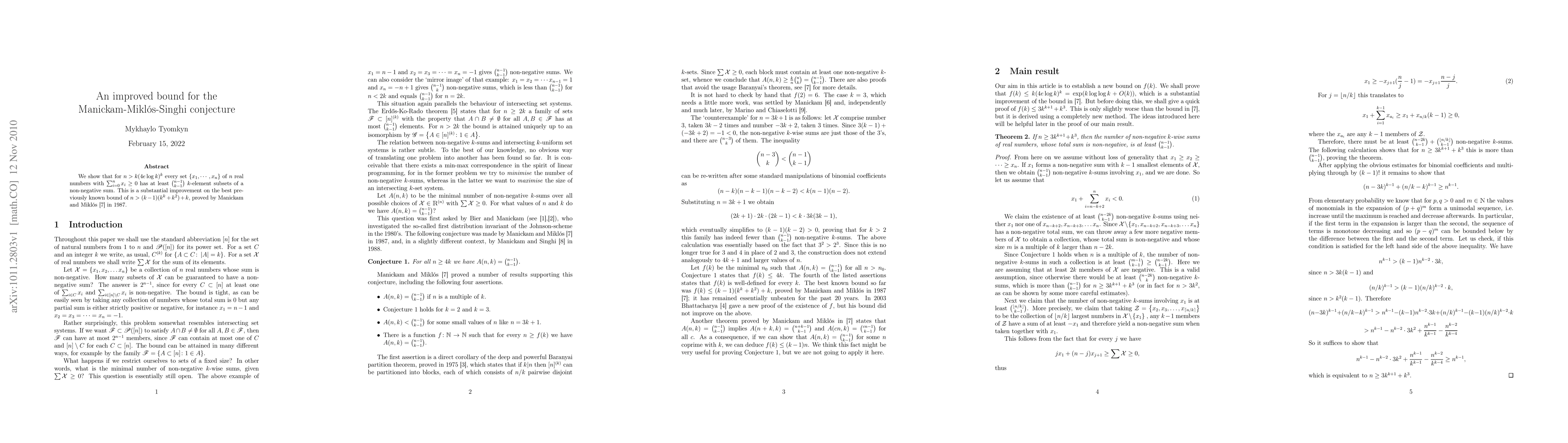 We show that for $n>k(4e\log k)^k$ every set $\{x_1,..., x_n\}$ of $n$ real numbers with $\sum_{i=0}^{n}x_i \geq 0$ has at least $\binom{n-1}{k-1}$ $k$-element subsets of a non-negative sum. This is a substantial improvement on the best previously known bound of $n>(k-1)(k^k+k^2)+k$, proved by Manickam and Mikl\'os \cite{MM} in 1987.