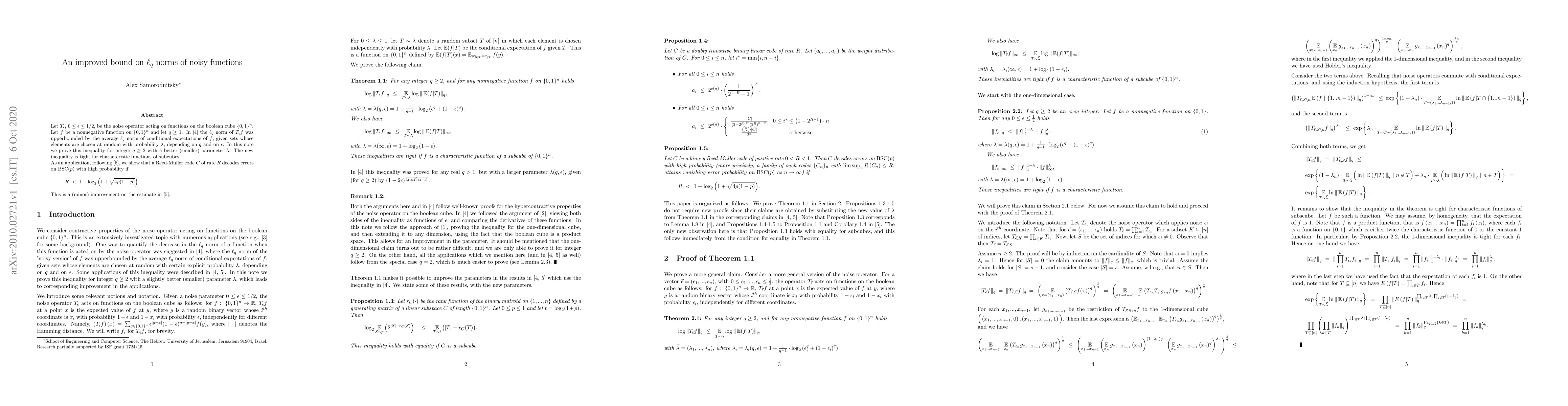 This paper improves a bound on the $ au_q$ norm of noisy functions for integer $q ge 2$, with better parameters, and demonstrates its application to Reed-Muller codes in error correction.