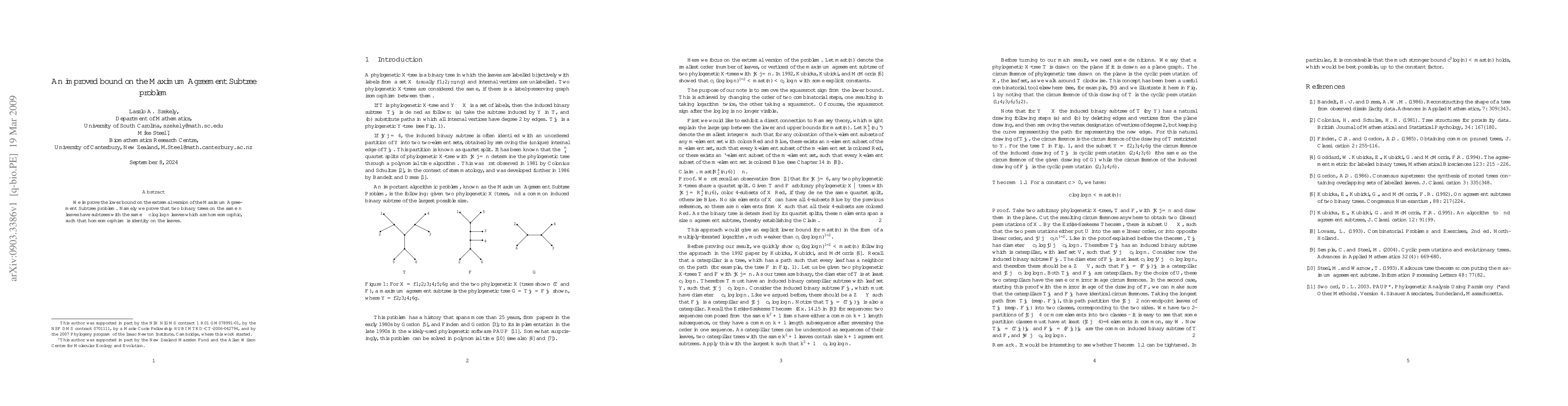 Summary: This paper enhances the lower bound for the Maximum Agreement Subtree problem, demonstrating that two binary trees on the same $n$ leaves must contain subtrees of at least $c\log\log n$ identical leaves, with a homeomorphism that maps leaves to themselves.