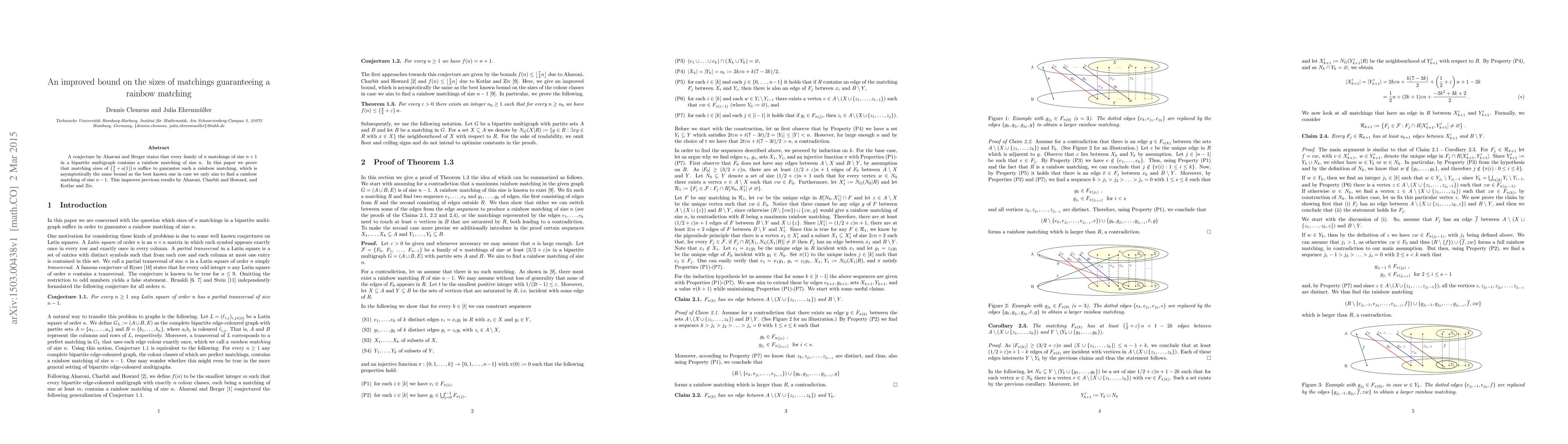 A conjecture by Aharoni and Berger states that every family of $n$ matchings of size $n+1$ in a bipartite multigraph contains a rainbow matching of size $n$. In this paper we prove that matching sizes of $(3/2 + o(1)) n$ suffice to guarantee such a rainbow matching, which is asymptotically the same bound as the best known one in case we only aim to find a rainbow matching of size $n-1$. This improves previous results by Aharoni, Charbit and Howard, and Kotlar and Ziv.