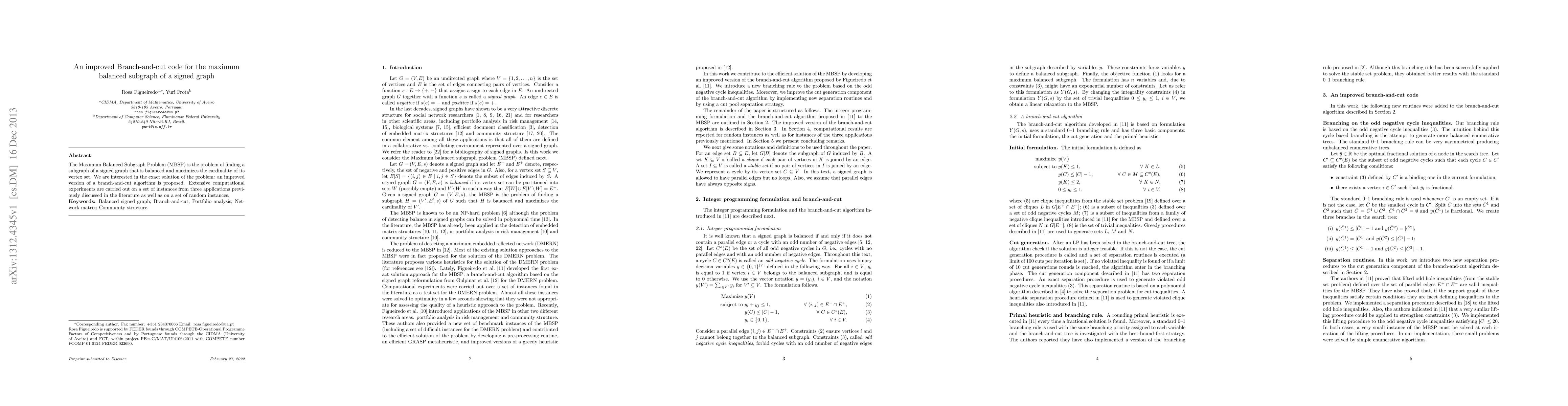 The Maximum Balanced Subgraph Problem (MBSP) is the problem of finding a subgraph of a signed graph that is balanced and maximizes the cardinality of its vertex set. We are interested in the exact solution of the problem: an improved version of a branch-and-cut algorithm is proposed. Extensive computational experiments are carried out on a set of instances from three applications previously discussed in the literature as well as on a set of random instances.