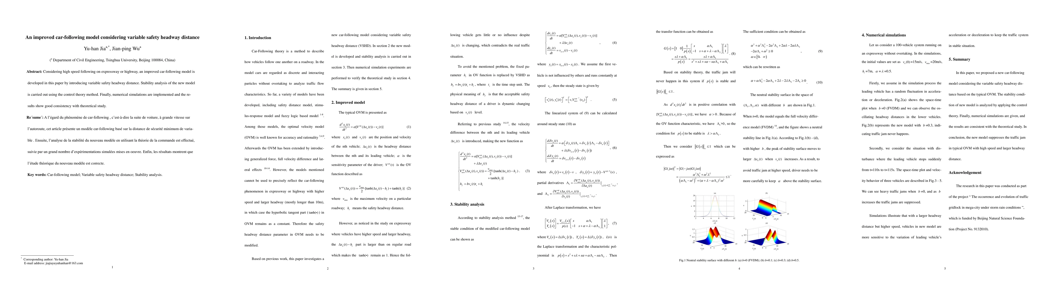 This paper develops an improved car-following model that incorporates variable safety headway distance to address high-speed driving on expressways. Stability analysis is performed using control theory, and numerical simulations confirm the model's theoretical consistency.