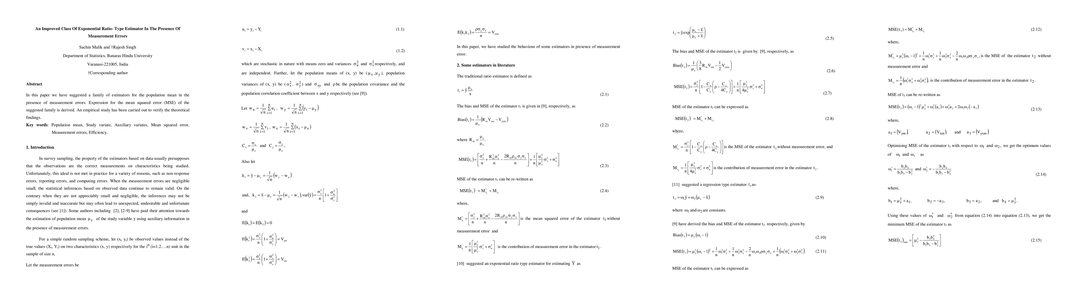 This paper proposes a new class of exponential ratio-type estimators for the population mean, accounting for measurement errors, and derives the mean squared error (MSE) expressions. An empirical study confirms the theoretical findings.
