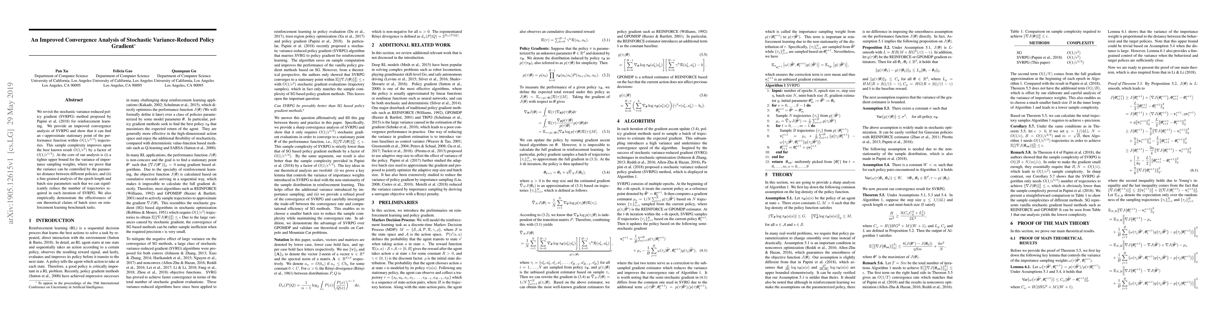 This paper improves the convergence analysis of the stochastic variance-reduced policy gradient (SVRPG) method, achieving an $\epsilon$-approximate stationary point within $O(1/\epsilon^{5/3})$ trajectories, surpassing the previous $O(1/\epsilon^2)$ complexity. The improvement hinges on tighter variance bounds and optimized epoch length and batch size parameters.