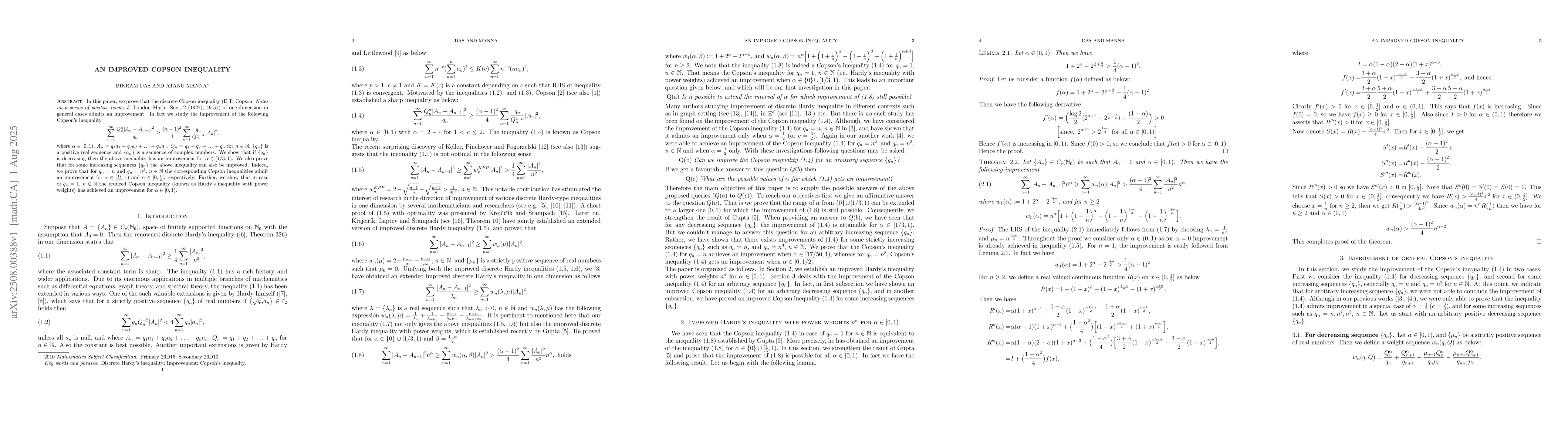 In this paper, we prove that the discrete Copson inequality (E.T. Copson, \emph{Notes on a series of positive terms}, J. London Math. Soc., 2 (1927), 49-51) of one-dimension in general cases admits an improvement. In fact we study the improvement of the following Copson's inequality \begin{align*} &\displaystyle\sum_{n=1}^{\infty}\frac{Q_{n}^{\alpha}|A_n-A_{n-1}|^{2}}{q_{n}}\geq\frac{(\alpha-1)^2}{4}\displaystyle\sum_{n=1}^{\infty} \frac{q_{n}}{Q_{n}^{2-\alpha}}|A_{n}|^{2}, \end{align*}where $\alpha\in[0,1)$, $A_{n}=q_{1}a_{1}+ q_{2}a_{2}+ \ldots +q_{n}a_{n}$, $Q_{n}=q_1+q_2+\ldots+q_{n}$ for $n\in \mathbb{N}$, $\{q_n\}$ is a positive real sequence and $\{a_n\}$ is a sequence of complex numbers. We show that if $\{q_n\}$ is decreasing then the above inequality has an improvement for $\alpha\in [1/3, 1)$. We also prove that for some increasing sequences $\{q_n\}$ the above inequality can also be improved. Indeed, we prove that for $q_{n}=n$ and $q_n=n^3$, $n\in \mathbb{N}$ the corresponding Copson inequalities admit an improvement for $\alpha\in[\frac{17}{50}, 1)$ and $\alpha\in[0, \frac{1}{2}]$, respectively. Further, we show that in case of $q_{n}=1$, $n\in \mathbb{N}$ the reduced Copson inequality (known as Hardy's inequality with power weights) has achieved an improvement for $\alpha\in[0, 1)$.