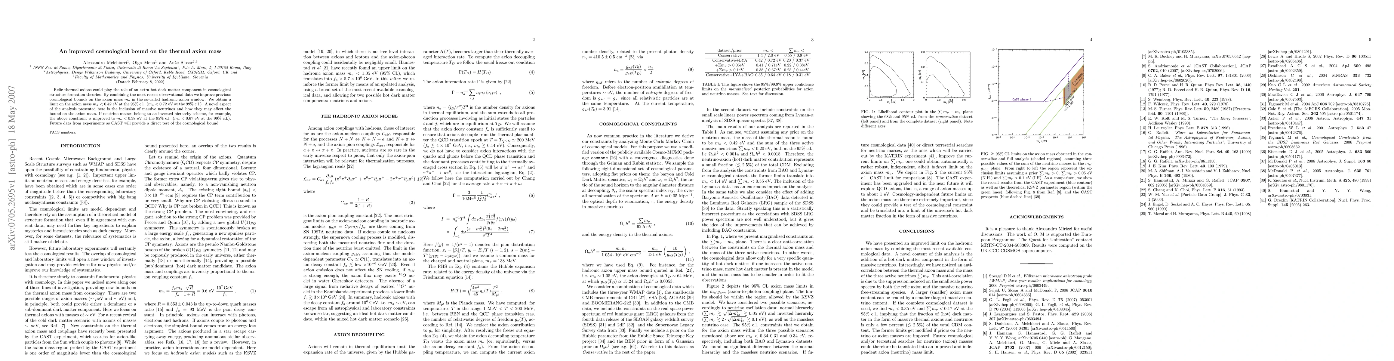 This study refines the upper limit on the thermal axion mass, a potential component of hot dark matter, to m_a < 0.42 eV at 95% confidence. By integrating recent observational data and considering massive neutrinos, especially under an inverted hierarchy, the bound is further tightened to m_a < 0.38 eV.