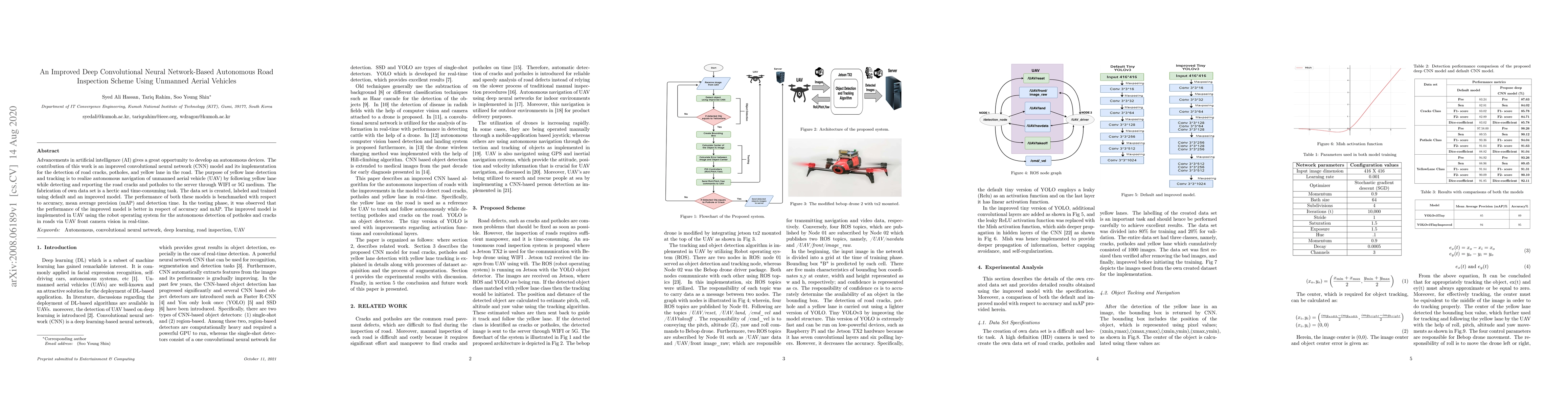 Advancements in artificial intelligence (AI) gives a great opportunity to develop an autonomous devices. The contribution of this work is an improved convolutional neural network (CNN) model and its implementation for the detection of road cracks, potholes, and yellow lane in the road. The purpose of yellow lane detection and tracking is to realize autonomous navigation of unmanned aerial vehicle (UAV) by following yellow lane while detecting and reporting the road cracks and potholes to the server through WIFI or 5G medium. The fabrication of own data set is a hectic and time-consuming task. The data set is created, labeled and trained using default and an improved model. The performance of both these models is benchmarked with respect to accuracy, mean average precision (mAP) and detection time. In the testing phase, it was observed that the performance of the improved model is better in respect of accuracy and mAP. The improved model is implemented in UAV using the robot operating system for the autonomous detection of potholes and cracks in roads via UAV front camera vision in real-time.