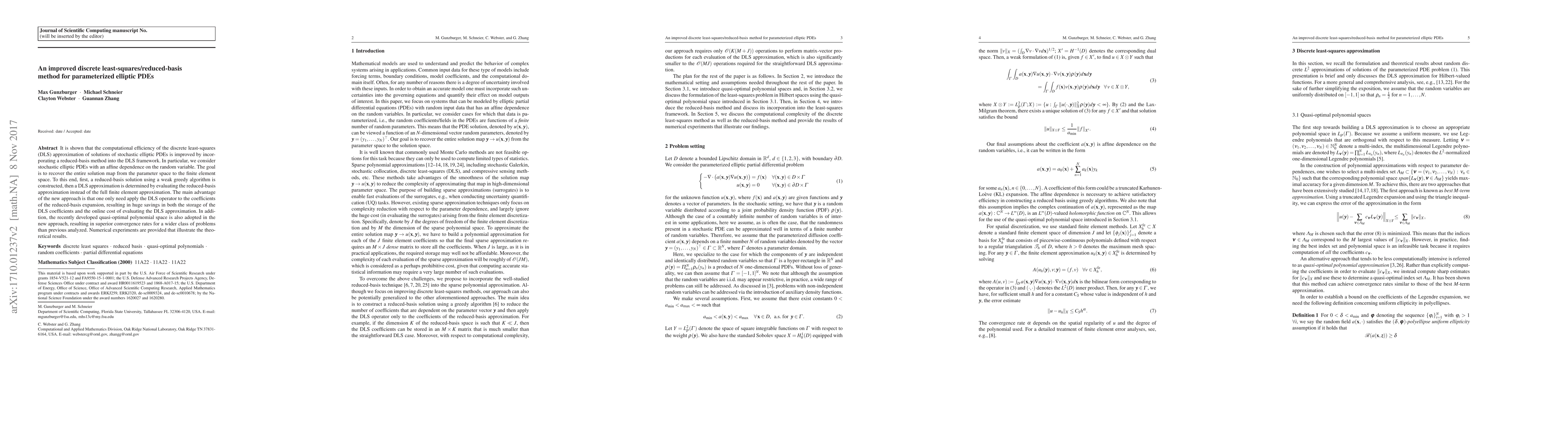 This paper proposes an enhanced discrete least-squares/reduced-basis method for solving parameterized elliptic PDEs, achieving significant computational efficiency gains by integrating reduced-basis techniques and quasi-optimal polynomial spaces, which results in reduced storage and faster evaluation times. Numerical experiments validate the improved convergence rates of the new approach.