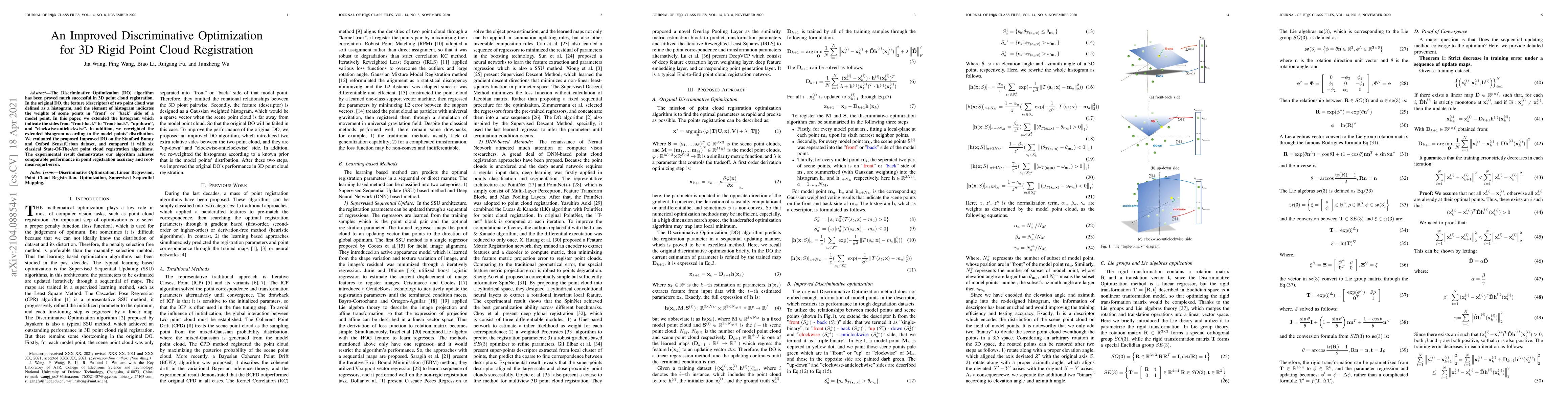 The Discriminative Optimization (DO) algorithm has been proved much successful in 3D point cloud registration. In the original DO, the feature (descriptor) of two point cloud was defined as a histogram, and the element of histogram indicates the weights of scene points in "front" or "back" side of a model point. In this paper, we extended the histogram which indicate the sides from "front-back" to "front-back", "up-down", and "clockwise-anticlockwise". In addition, we reweighted the extended histogram according to the model points' distribution. We evaluated the proposed Improved DO on the Stanford Bunny and Oxford SensatUrban dataset, and compared it with six classical State-Of-The-Art point cloud registration algorithms. The experimental result demonstrates our algorithm achieves comparable performance in point registration accuracy and root-mean-sqart-error.