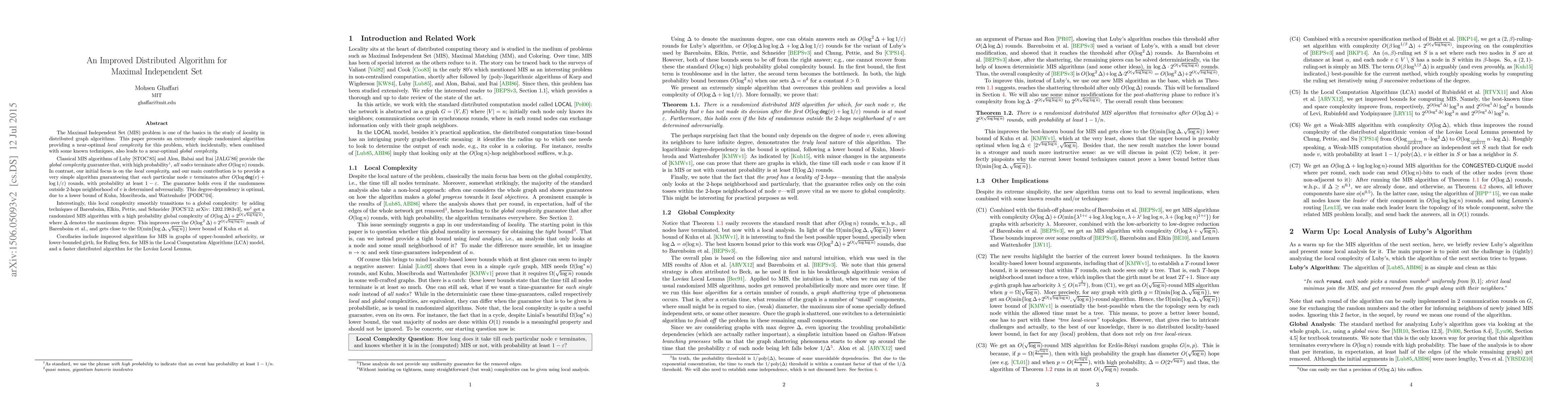 A new algorithm for finding the maximal independent set in a graph reduces local complexity to O(log deg(v) + log(1/epsilon)) rounds, while also achieving near-optimal global complexity when combined with other techniques.