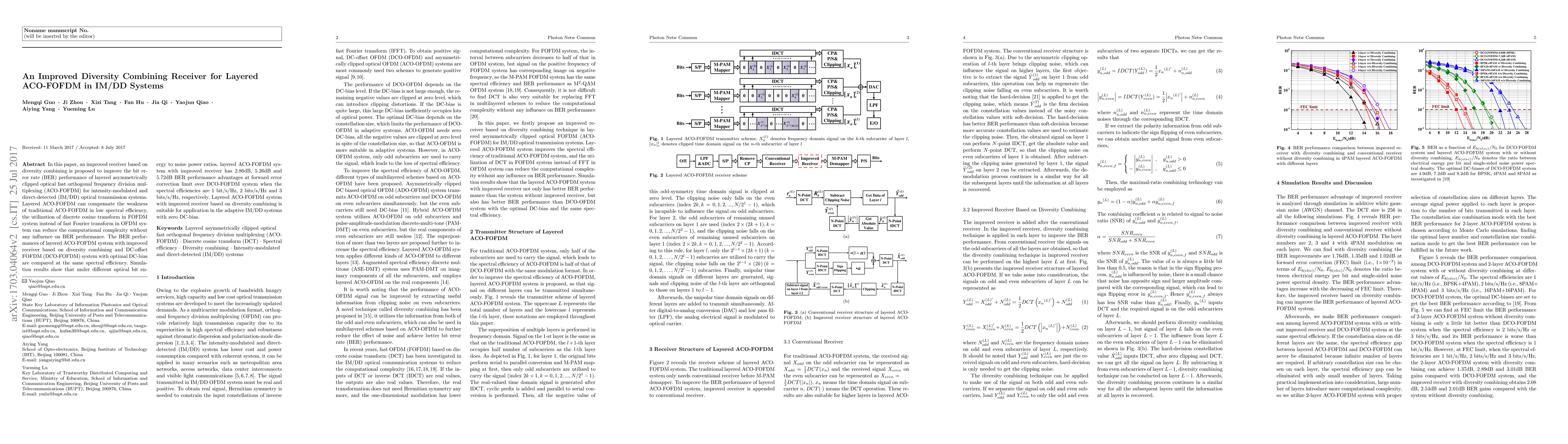 In this paper, an improved receiver based on diversity combining is proposed to improve the bit error rate (BER) performance of layered asymmetrically clipped optical fast orthogonal frequency division multiplexing (ACO-FOFDM) for intensity-modulated and direct-detected (IM/DD) optical transmission systems. Layered ACO-FOFDM can compensate the weakness of traditional ACO-FOFDM in low spectral efficiency, the utilization of discrete cosine transform in FOFDM system instead of fast Fourier transform in OFDM system can reduce the computational complexity without any influence on BER performance. The BER performances of layered ACO-FOFDM system with improved receiver based on diversity combining and DC-offset FOFDM (DCO-FOFDM) system with optimal DC-bias are compared at the same spectral efficiency. Simulation results show that under different optical bit energy to noise power ratios, layered ACO-FOFDM system with improved receiver has 2.86dB, 5.26dB and 5.72dB BER performance advantages at forward error correction limit over DCO-FOFDM system when the spectral efficiencies are 1 bit/s/Hz, 2 bits/s/Hz and 3 bits/s/Hz, respectively. Layered ACO-FOFDM system with improved receiver based on diversity combining is suitable for application in the adaptive IM/DD systems with zero DC-bias.