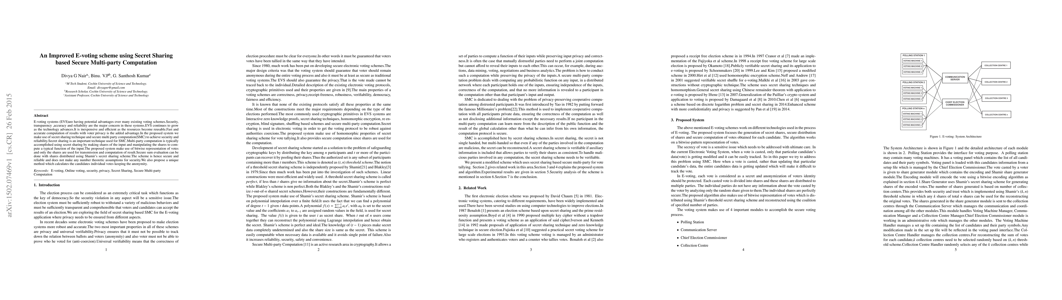 This paper proposes an enhanced e-voting scheme using secret sharing and secure multi-party computation to ensure security, transparency, and reliability. It employs Shamir's secret sharing for secure sum evaluation and a unique method to calculate individual candidate votes while maintaining voter anonymity.