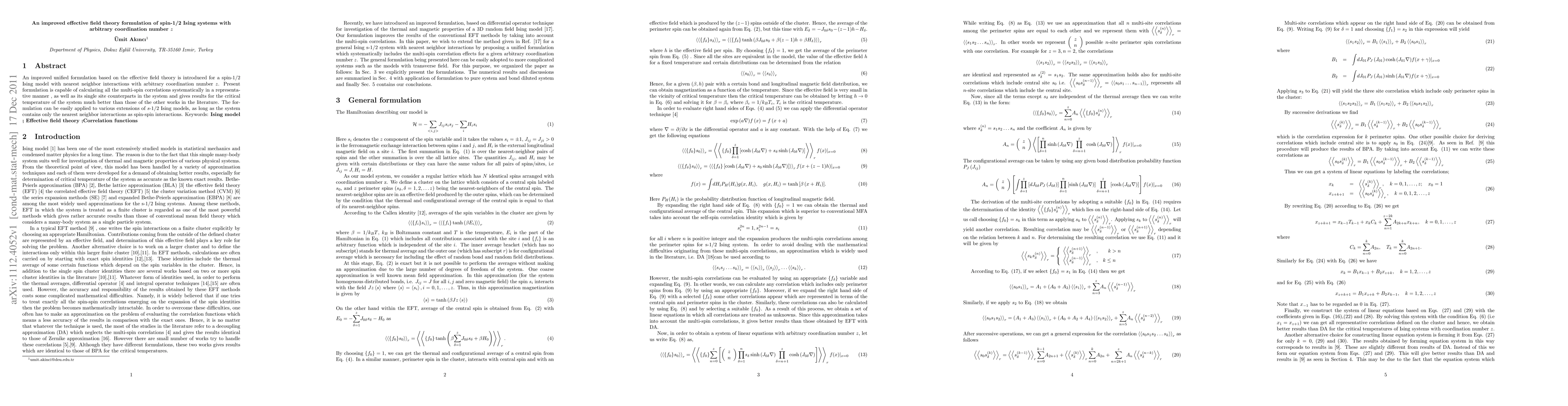 An improved unified formulation based on the effective field theory is introduced for a spin-1/2 Ising model with nearest neighbor interactions with arbitrary coordination number z. Present formulation is capable of calculating all the multi-spin correlations systematically in a representative manner, as well as its single site counterparts in the system and gives results for the critical temperature of the system much better than those of the other works in the literature. The formulation can be easily applied to various extensions of s-1/2 Ising models, as long as the system contains only the nearest neighbor interactions as spin-spin interactions.