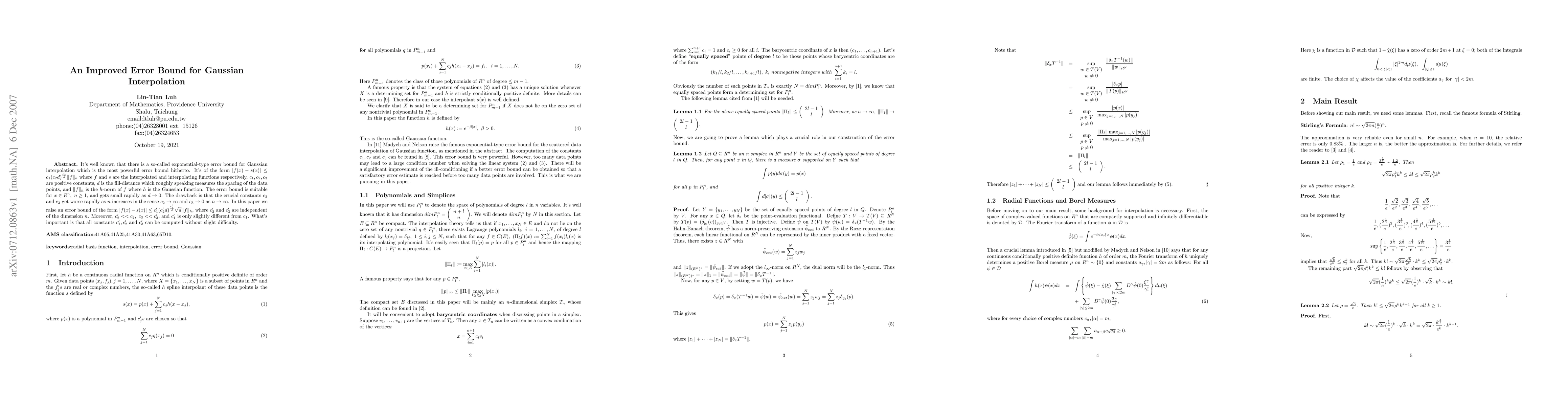 Summary: This paper introduces an improved error bound for Gaussian Interpolation, surpassing the existing exponential-type error bound and providing more accurate estimates.
