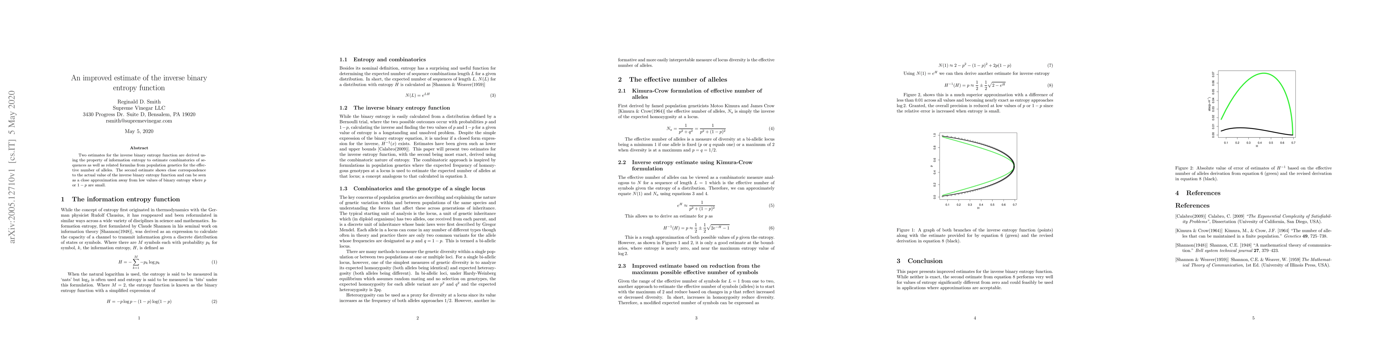 Two estimates for the inverse binary entropy function are derived using the property of information entropy to estimate combinatorics of sequences as well as related formulas from population genetics for the effective number of alleles. The second estimate shows close correspondence to the actual value of the inverse binary entropy function and can be seen as a close approximation away from low values of binary entropy where $p$ or $1-p$ are small.