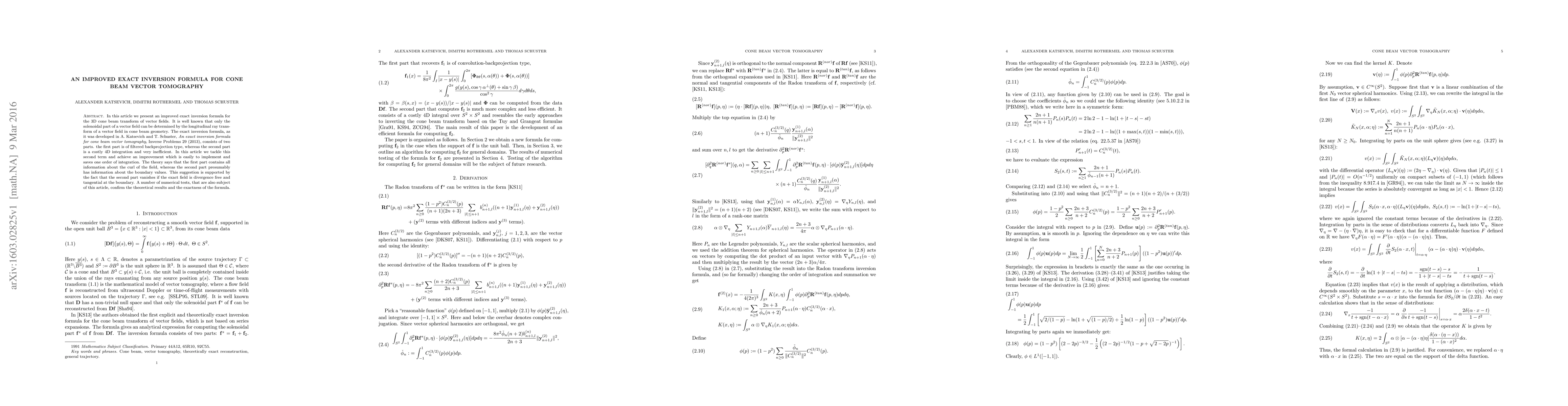 In this article we present an improved exact inversion formula for the 3D cone beam transform of vector fields. It is well known that only the solenoidal part of a vector field can be determined by the longitudinal ray transform of a vector field in cone beam geometry. The exact inversion formula, as it was developed in A. Katsevich and T. Schuster, 'An exact inversion formula for cone beam vector tomography', Inverse Problems 29 (2013), consists of two parts. the first part is of filtered backprojection type, whereas the second part is a costly 4D integration and very inefficient. In this article we tackle this second term and achieve an improvement which is easily to implement and saves one order of integration. The theory says that the first part contains all information about the curl of the field, whereas the second part presumably has information about the boundary values. This suggestion is supported by the fact that the second part vanishes if the exact field is divergence free and tangential at the boundary. A number of numerical tests, that are also subject of this article, confirm the theoretical results and the exactness of the formula.