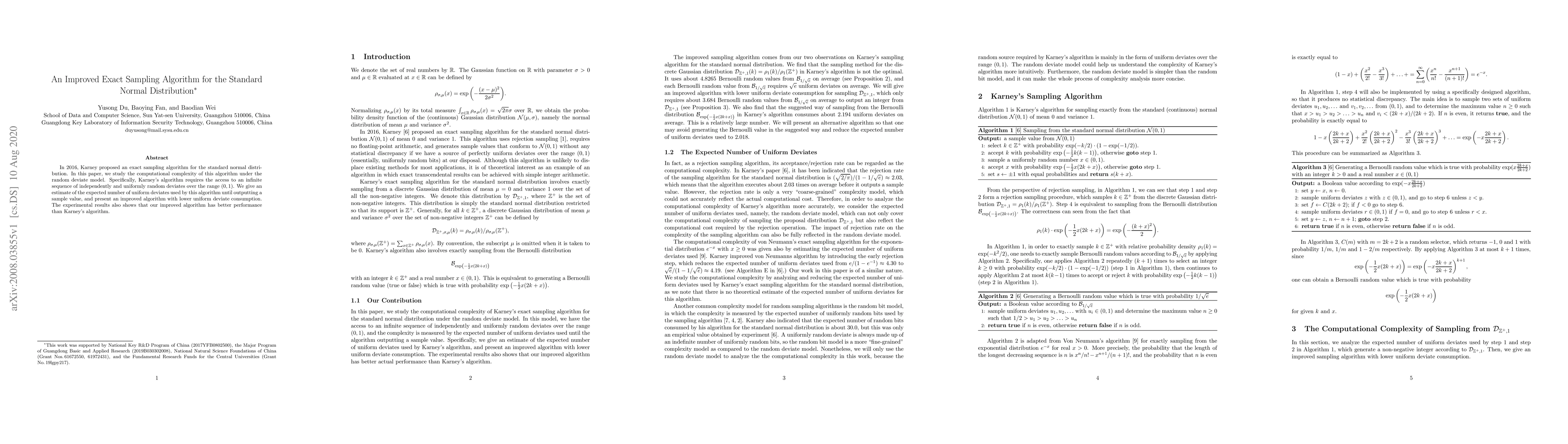 This paper improves upon Karney's 2016 exact sampling algorithm for the standard normal distribution, estimating its computational complexity and presenting a new version that uses fewer uniform random deviates, with experimental results showing better performance.