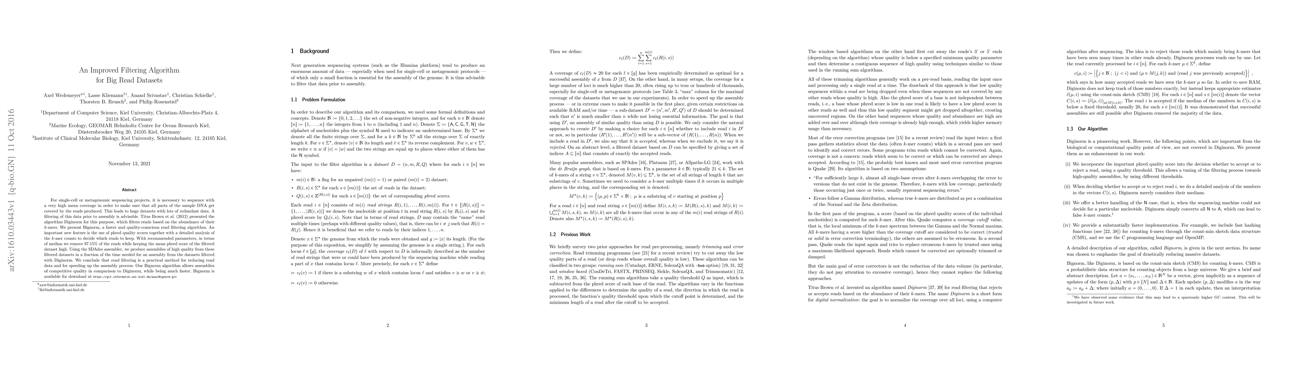 A new read filtering algorithm called Bignorm reduces noise in large sequencing datasets while maintaining high-quality assemblies, outperforming existing algorithms like Diginorm.