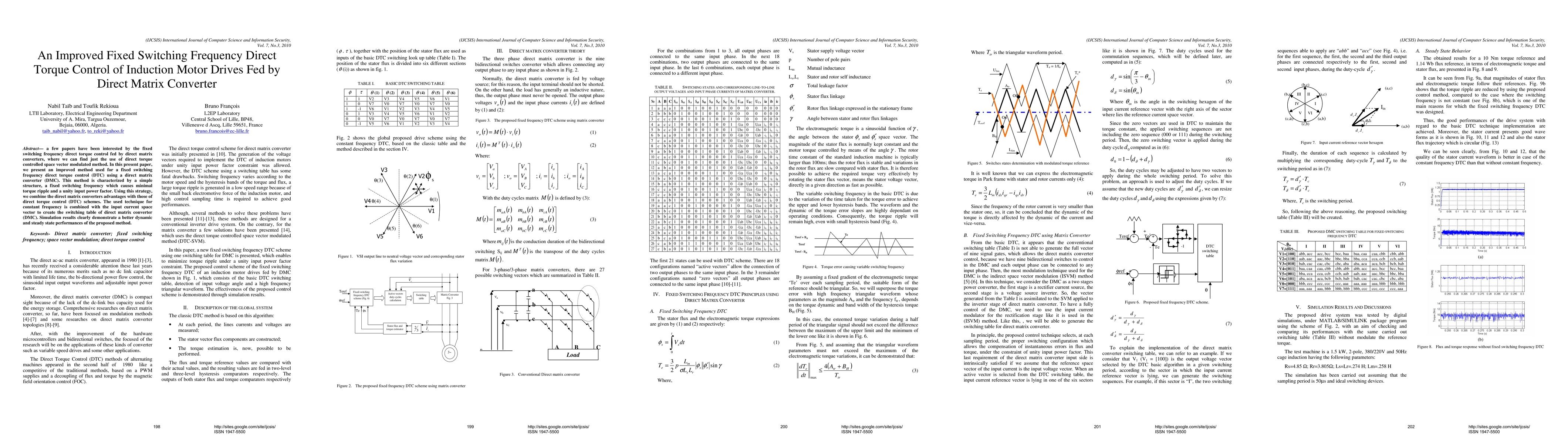 A few papers have been interested by the fixed switching frequency direct torque control fed by direct matrix converters, where we can find just the use of direct torque controlled space vector modulated method. In this present paper, we present an improved method used for a fixed switching frequency direct torque control (DTC) using a direct matrix converter (DMC). This method is characterized by a simple structure, a fixed switching frequency which causes minimal torque ripple and a unity input power factor. Using this strategy, we combine the direct matrix converters advantages with those of direct torque control (DTC) schemes. The used technique for constant frequency is combined with the input current space vector to create the switching table of direct matrix converter (DMC). Simulation results clearly demonstrate a better dynamic and steady state performances of the proposed method.