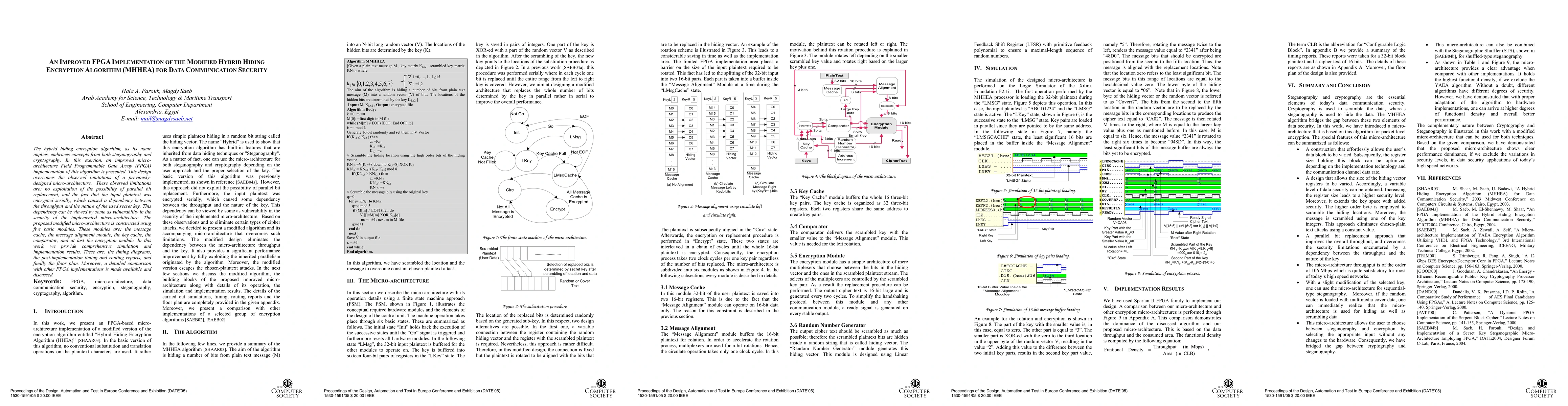 This paper presents an improved FPGA implementation of the Modified Hybrid Hiding Encryption Algorithm (MHHEA), addressing previous limitations by enabling parallel bit replacement and eliminating throughput dependency on the secret key. The design comprises five modules: message cache, alignment, key cache, comparator, and encryption, with comprehensive simulation and comparison results provided.