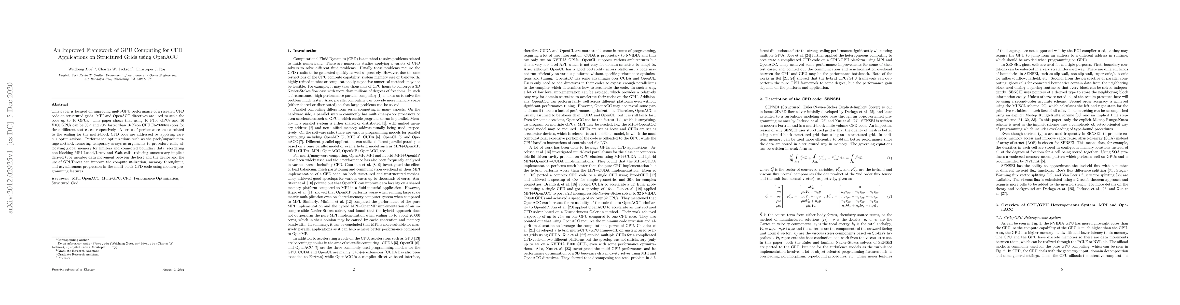 This paper enhances multi-GPU performance of a CFD code on structured grids using OpenACC and MPI, achieving up to 70× speedup over CPU cores with optimizations. Key improvements include memory management, asynchronous communication, and minimizing data movement between host and device.