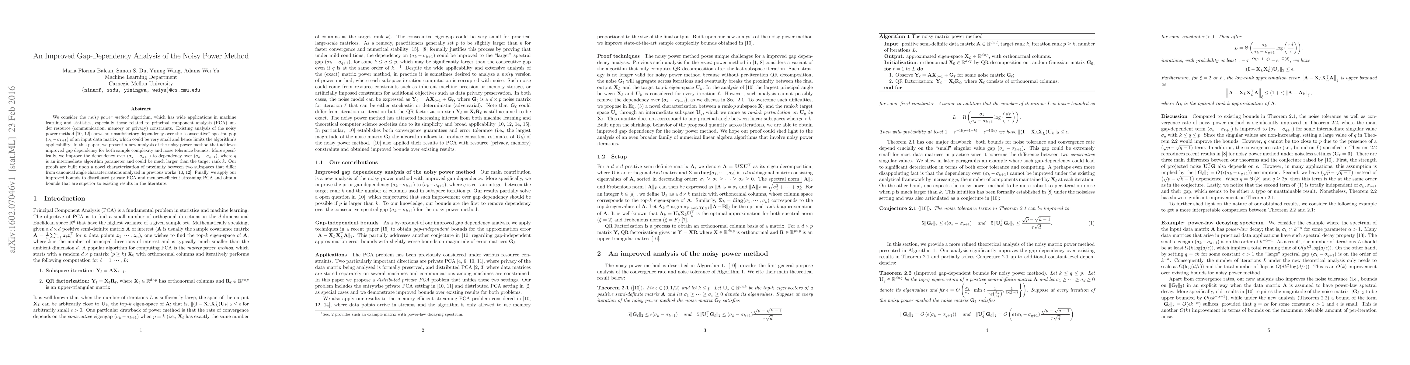 This paper presents a refined analysis of the noisy power method, improving its gap dependency for both sample complexity and noise tolerance. The new analysis reduces dependency on the small "consecutive" spectral gap, enhancing the algorithm's applicability, especially in resource-constrained PCA scenarios.