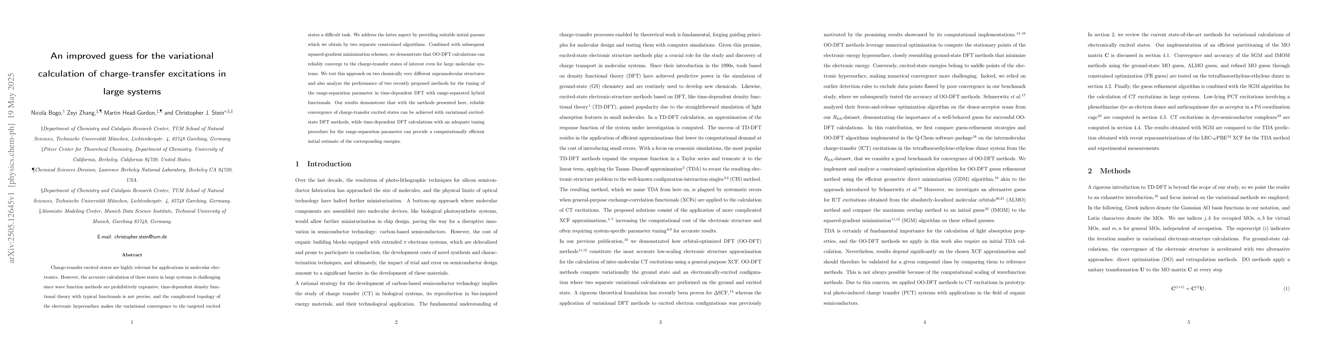 The paper introduces improved initial guess methods for variational calculations of charge-transfer excited states, enhancing the convergence of OO-DFT calculations in large molecular systems.