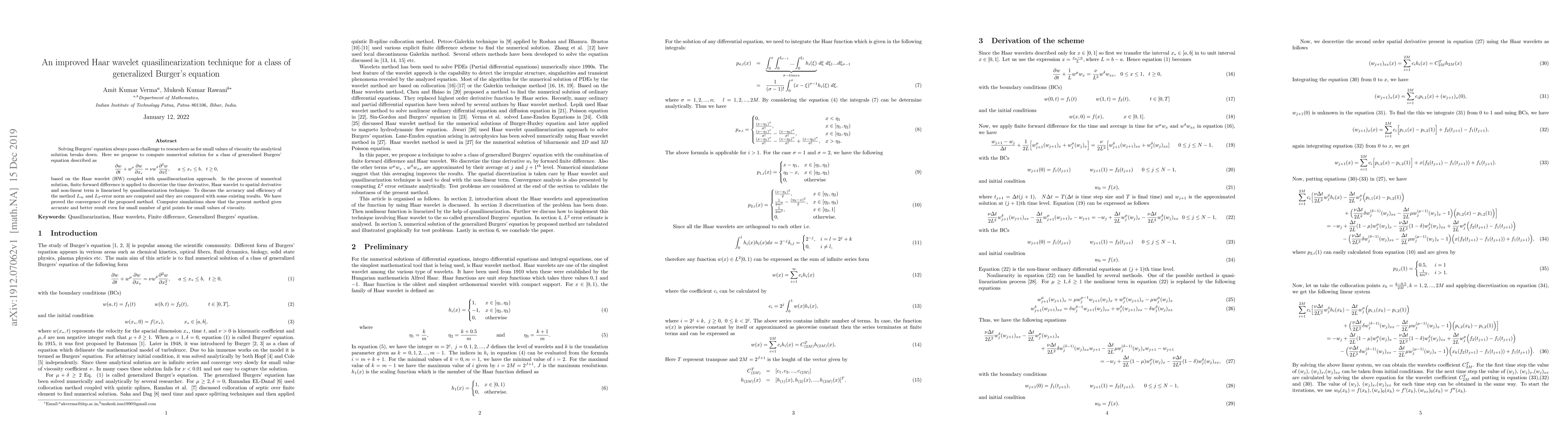 Solving Burgers' equation always poses challenge to researchers as for small values of viscosity the analytical solution breaks down. Here we propose to compute numerical solution for a class of generalised Burgers' equation described as $$ \frac{\partial w}{\partial t}+ w^{\mu}\frac{\partial w}{\partial x_{*}}=\nu w^{\delta}\frac{\partial^2 w}{\partial x^{2}_{*}},\hspace{0.2in}a \leq x_{*}\leq b,~~t\geq 0,$$ based on the Haar wavelet (HW) coupled with quasilinearization approach. In the process of numerical solution, finite forward difference is applied to discretize the time derivative, Haar wavelet to spatial derivative and non-linear term is linearized by quasilinearization technique. To discuss the accuracy and efficiency of the method $L_{\infty}$ and $L_{2}$-error norm are computed and they are compared with some existing results. We have proved the convergence of the proposed method. Computer simulations show that the present method gives accurate and better result even for small number of grid points for small values of viscosity.