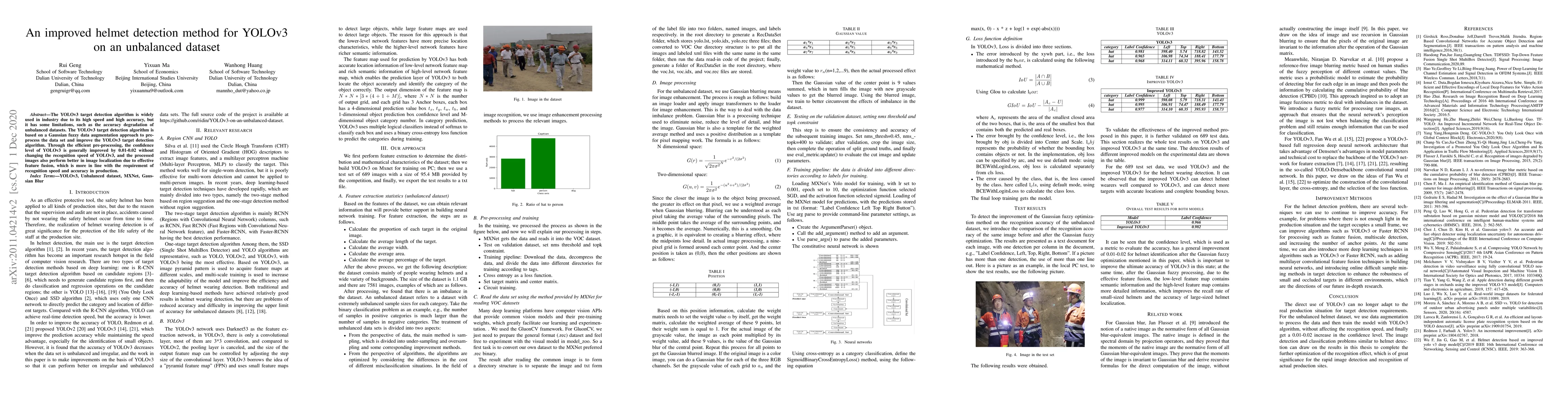 This paper proposes an improved method for YOLOv3 helmet detection using Gaussian fuzzy data augmentation to address accuracy degradation on unbalanced datasets, enhancing detection confidence by 0.01-0.02 without sacrificing speed, and improving image localization through effective feature fusion.