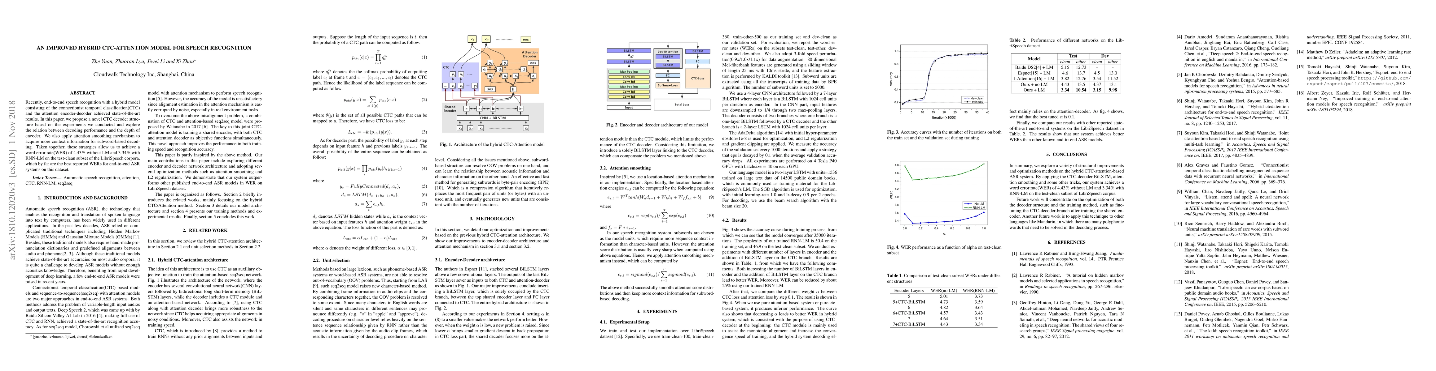Recently, end-to-end speech recognition with a hybrid model consisting of the connectionist temporal classification(CTC) and the attention encoder-decoder achieved state-of-the-art results. In this paper, we propose a novel CTC decoder structure based on the experiments we conducted and explore the relation between decoding performance and the depth of encoder. We also apply attention smoothing mechanism to acquire more context information for subword-based decoding. Taken together, these strategies allow us to achieve a word error rate(WER) of 4.43% without LM and 3.34% with RNN-LM on the test-clean subset of the LibriSpeech corpora, which by far are the best reported WERs for end-to-end ASR systems on this dataset.