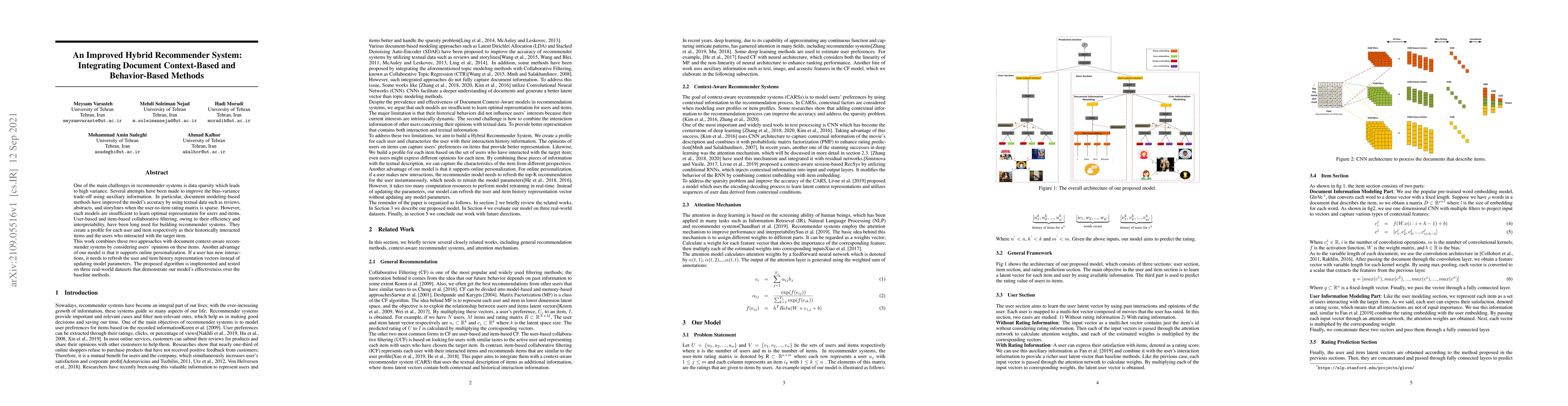 This paper proposes a hybrid recommender system combining user-based collaborative filtering with document context-aware modeling to improve accuracy and support online personalization. It demonstrates effectiveness on three real-world datasets over baseline methods.