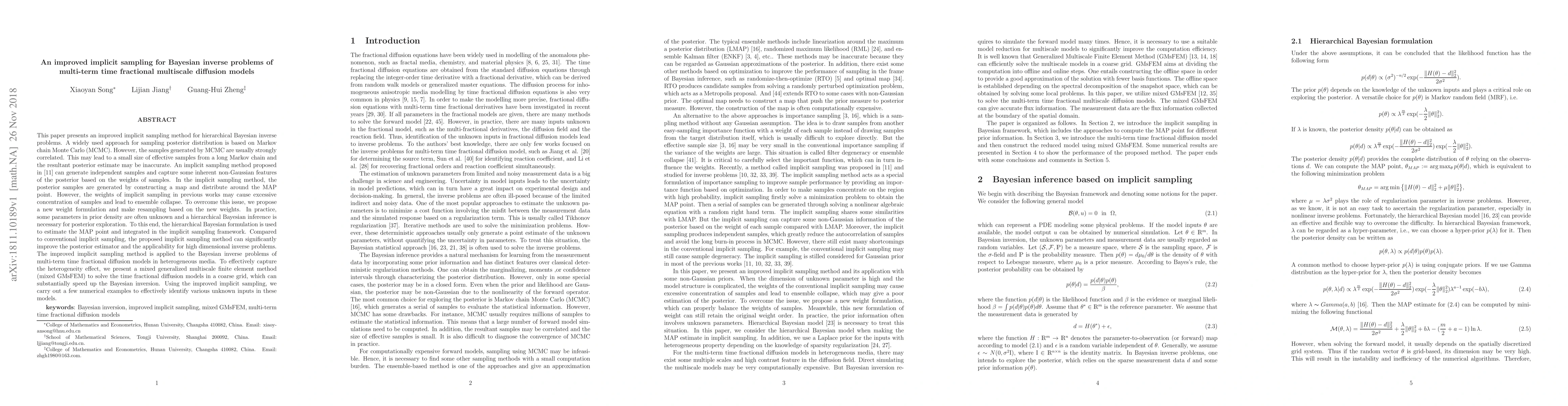 This paper presents an improved implicit sampling method for hierarchical Bayesian inverse problems. A widely used approach for sampling posterior distribution is based on Markov chain Monte Carlo (MCMC). However, the samples generated by MCMC are usually strongly correlated. This may lead to a small size of effective samples from a long Markov chain and the resultant posterior estimate may be inaccurate. An implicit sampling method proposed in [11] can generate independent samples and capture some inherent non-Gaussian features of the posterior based on the weights of samples. In the implicit sampling method, the posterior samples are generated by constructing a map and distribute around the MAP point. However, the weights of implicit sampling in previous works may cause excessive concentration of samples and lead to ensemble collapse. To overcome this issue, we propose a new weight formulation and make resampling based on the new weights. In practice, some parameters in prior density are often unknown and a hierarchical Bayesian inference is necessary for posterior exploration. To this end, the hierarchical Bayesian formulation is used to estimate the MAP point and integrated in the implicit sampling framework. Compared to conventional implicit sampling, the proposed implicit sampling method can significantly improve the posterior estimator and the applicability for high dimensional inverse problems. The improved implicit sampling method is applied to the Bayesian inverse problems of multi-term time fractional diffusion models in heterogeneous media. To effectively capture the heterogeneity effect, we present a mixed generalized multiscale finite element method (mixed GMsFEM) to solve the time fractional diffusion models in a coarse grid, which can substantially speed up the Bayesian inversion.