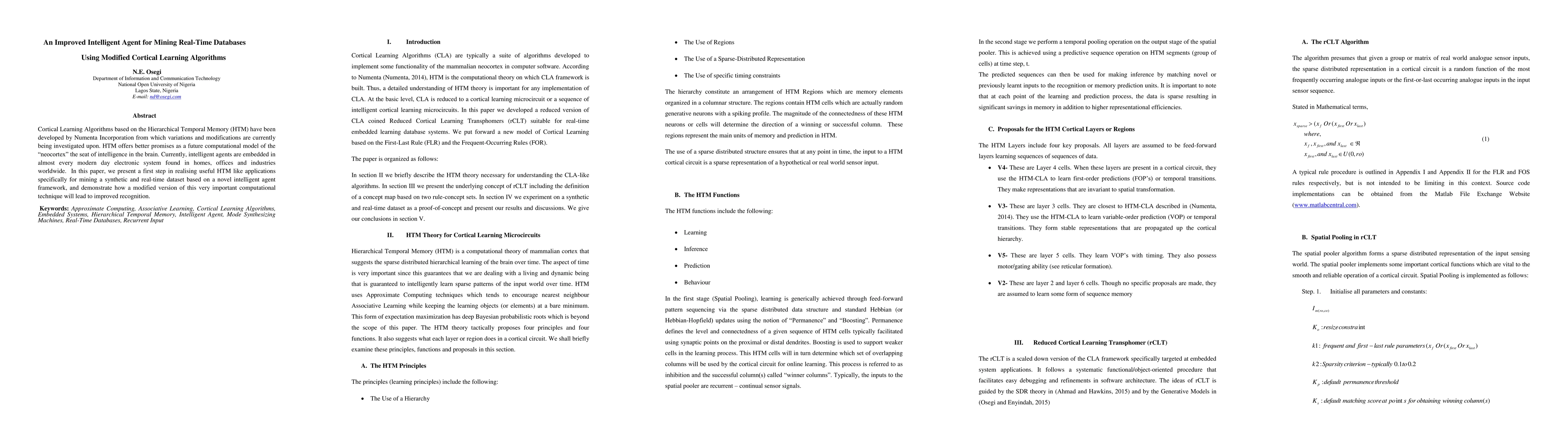 This paper introduces an enhanced intelligent agent framework utilizing modified Cortical Learning Algorithms based on Hierarchical Temporal Memory (HTM) for real-time database mining. The proposed approach aims to improve recognition and data mining capabilities in modern electronic systems.
