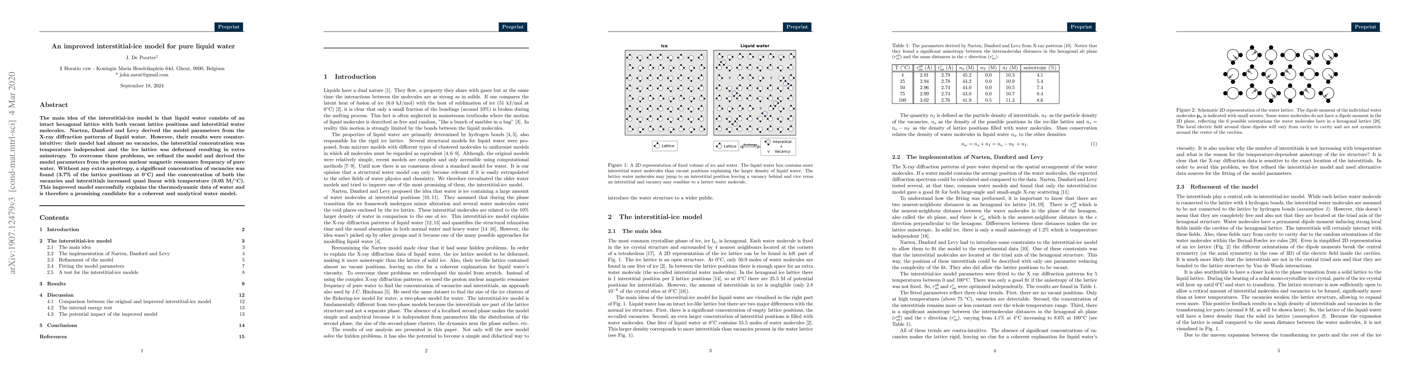 The main idea of the interstitial-ice model is that liquid water consists of an intact hexagonal lattice with both vacant lattice positions and interstitial water molecules. Narten, Danford and Levy derived the model parameters from the X-ray diffraction patterns of liquid water. However, their results were counter-intuitive: their model had almost no vacancies, the interstitial concentration was temperature independent and the ice lattice was deformed resulting in extra anisotropy. To overcome these problems, we refined the model and derived the model parameters from the proton nuclear magnetic resonance frequency of pure water. Without any extra anisotropy, a significant concentration of vacancies was found (3.7% of the lattice positions at 0{\deg}C) and the concentration of both the vacancies and interstitials increased quasi linear with temperature (0.05 M/{\deg}C). This improved model successfully explains the thermodynamic data of water and is therefore a promising candidate for a coherent and analytical water model.