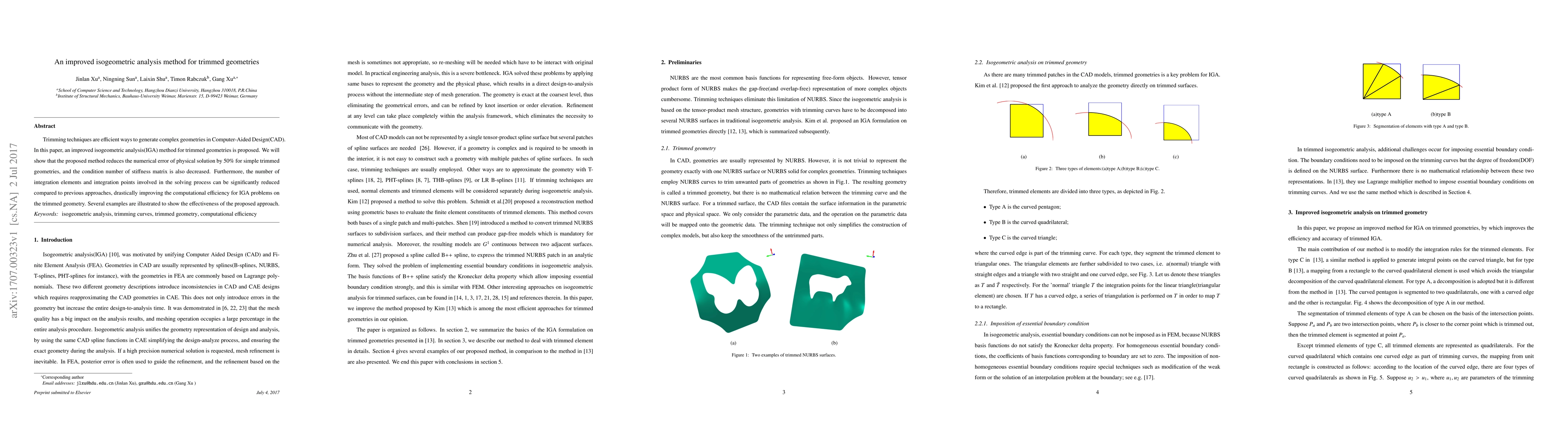 This paper proposes an improved isogeometric analysis method for trimmed geometries, demonstrating a 50% reduction in numerical error and a decrease in the stiffness matrix condition number, while significantly reducing computational resources and improving efficiency. The method's effectiveness is validated through various examples.