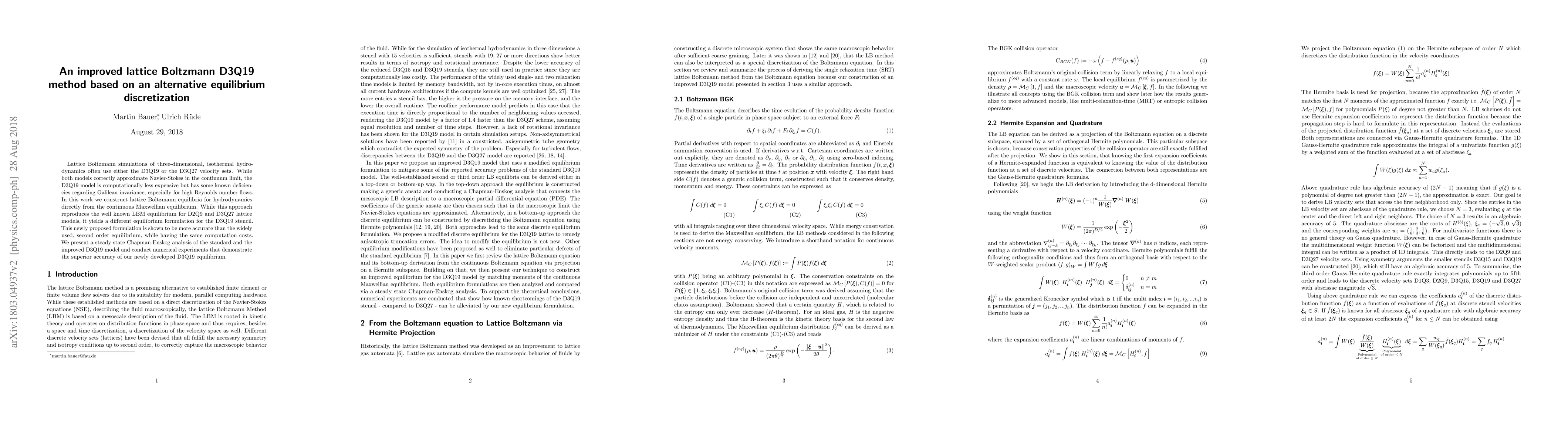 This paper proposes a novel lattice Boltzmann method for D3Q19 models that improves accuracy over the standard second-order equilibrium while maintaining computational efficiency. The new approach enhances Galilean invariance and demonstrates superior performance in numerical simulations.