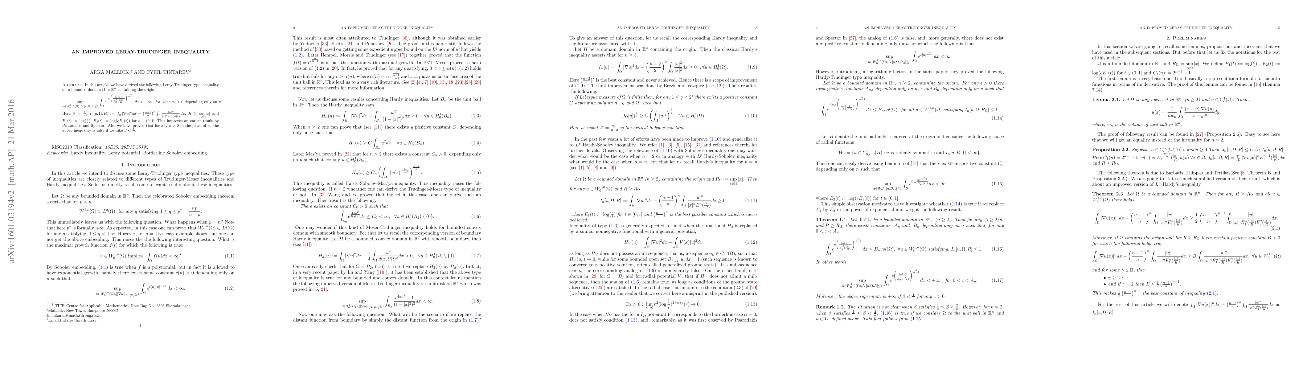 In this article, we have derived the following Leray-Trudinger type inequality on a bounded domain $\Omega$ in $\mathbb{R}^n $ containing the origin. \begin{align*} \displaystyle{\sup_{u\in W^{1,n}_{0}(\Omega), I_{n}[u,\Omega,R]\leq 1}}\int_{\Omega} e^{c_n\left(\frac{|u(x)|}{E_{2}^{\beta}(\frac{|x|}{R})}\right)^{\frac{n}{n-1}}} dx < +\infty \ \text{, for some } c_n>0 \ \text{depending only on } n. \end{align*} Here $\beta = \frac{2}{n}$, $I_n[u,\Omega,R] := \int_{\Omega}|\nabla u |^{n}dx- \left(\frac{n-1}{n}\right)^{n}\int_{\Omega}\frac{|u|^{n}}{|x|^{n}E_{1}^n(\frac{|x|}{R})}dx $, $R \geq \displaystyle{\sup_{x\in \Omega}}|x|$ and $E_{1}(t) := \log(\frac{e}{t})$, $E_{2}(t) := \log(eE_1(t))$ for $t\in (0,1].$ This improves an earlier result by Psaradakis and Spector. Also we have proved that, for any $c>0$ the above inequality is false, if we take $\beta < \frac{1}{n}.$