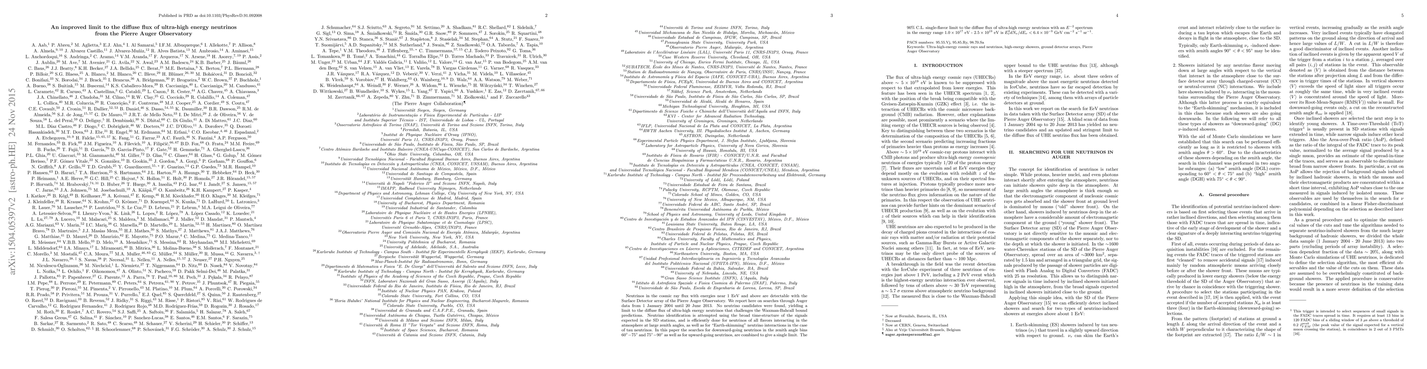 The Pierre Auger Observatory reports an improved limit on the diffuse flux of ultra-high energy neutrinos, finding no candidates and challenging Waxman-Bahcall bound predictions. The $90\%$ C.L. limit for an $E^{-2}$ spectrum in the energy range $1.0 \times 10^{17}$ eV - $2.5 \times 10^{19}$ eV is $E_\nu^2 dN_\nu/dE_\nu < 6.4 \times 10^{-9}~ {\rm GeV~ cm^{-2} ~s^{-1}~ sr^{-1}}$.