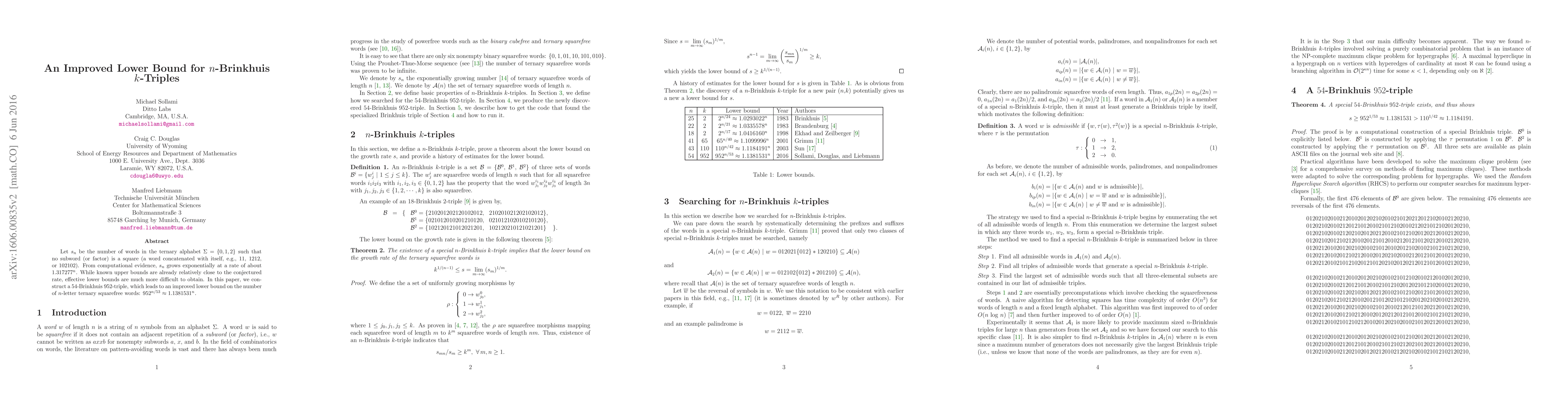 Let $s_n$ be the number of words consisting of the ternary alphabet consisting of the digits 0, 1, and 2 such that no subword (or factor) is a square (a word concatenated with itself, e.g., $11$, $1212$, or $102102$). From computational evidence, $s_n$ grows exponentially at a rate of about $1.317277^n$. While known upper bounds are already relatively close to the conjectured rate, effective lower bounds are much more difficult to obtain. In this paper, we construct a $54$-Brinkhuis $952$-triple, which leads to an improved lower bound on the number of $n$-letter ternary squarefree words: $952^{n/53} \approx 1.1381531^n$.