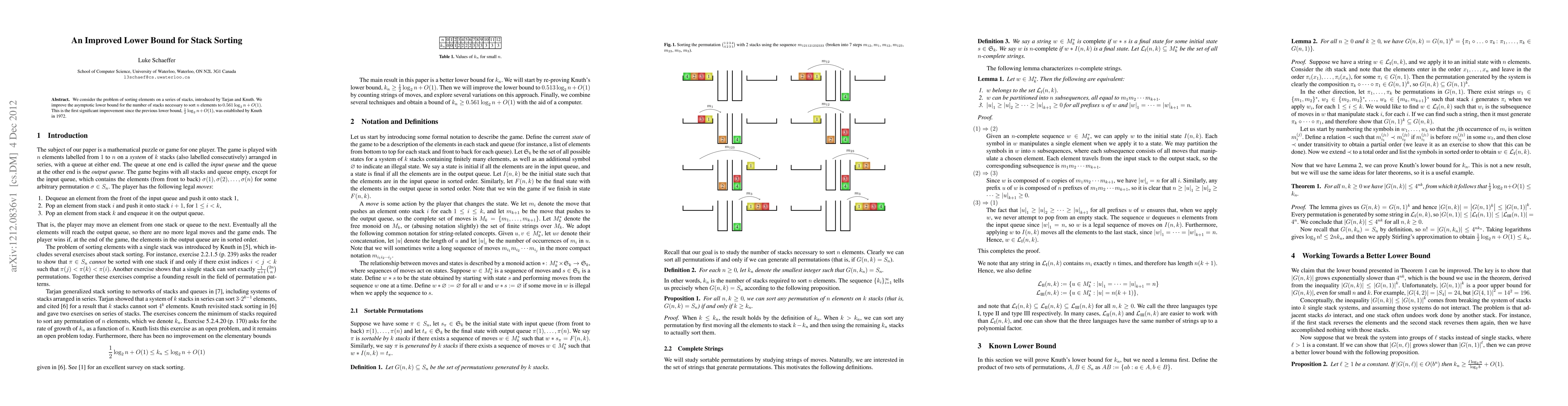 We consider the problem of sorting elements on a series of stacks, introduced by Tarjan and Knuth. We improve the asymptotic lower bound for the number of stacks necessary to sort $n$ elements to $0.561 \log_2 n + O(1)$. This is the first significant improvement since the previous lower bound, $1/2 \log_2 n + O(1)$, was established by Knuth in 1972.