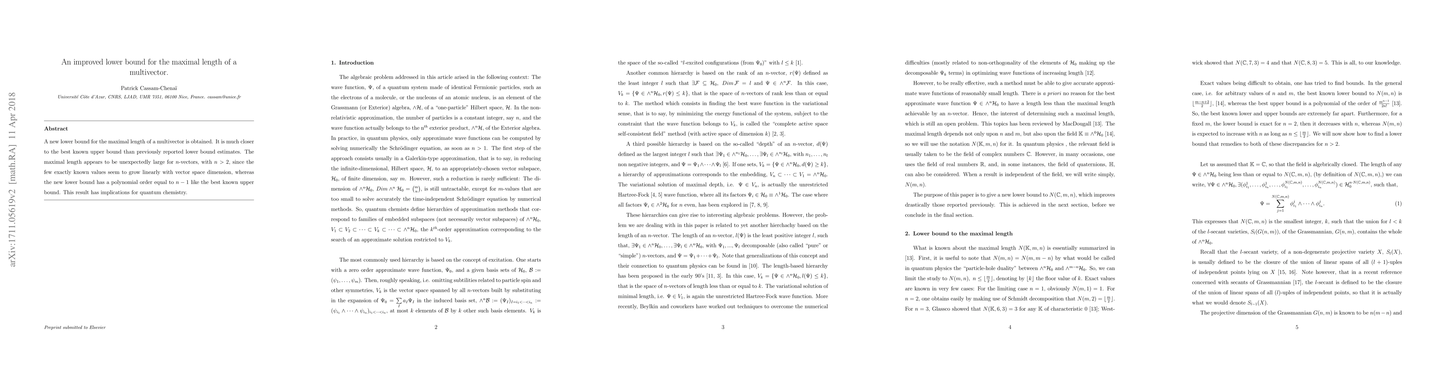 A new lower bound for the maximal length of a multivector is obtained. It is much closer to the best known upper bound than previously reported lower bound estimates. The maximal length appears to be unexpectedly large for $n$-vectors, with n>2, since the few exactly known values seem to grow linearly with vector space dimension, whereas the new lower bound has a polynomial order equal to n-1 like the best known upper bound. This result has implications for quantum chemistry.