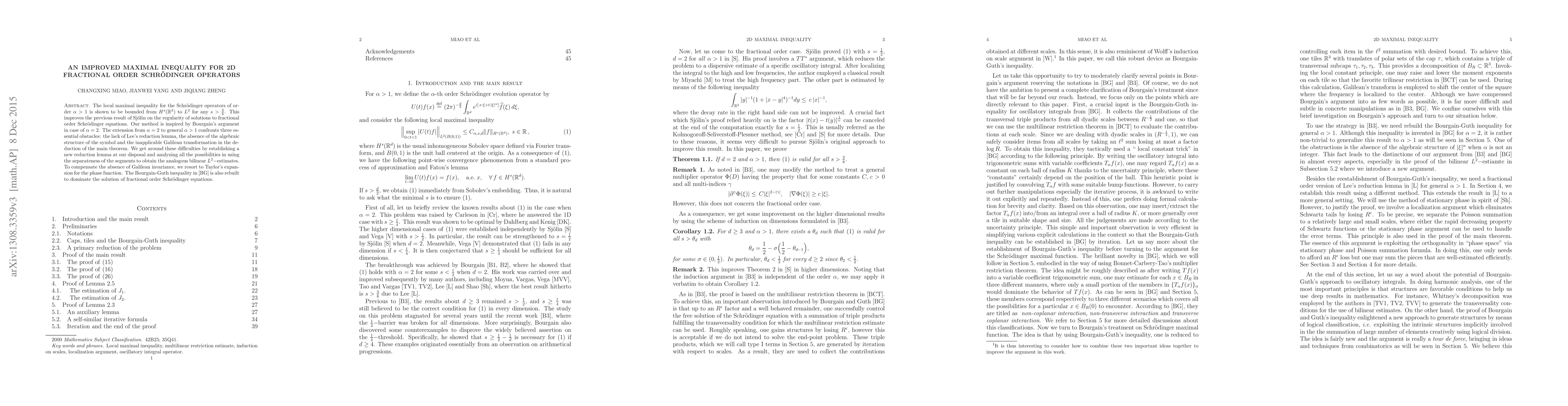 This paper improves the maximal inequality for 2D fractional order Schrödinger operators, showing boundedness from $H^s(\R^2)$ to $L^2$ for $s>\frac38$. The authors overcome obstacles by developing a new reduction lemma and using Taylor expansion to compensate for the lack of Galilean invariance.