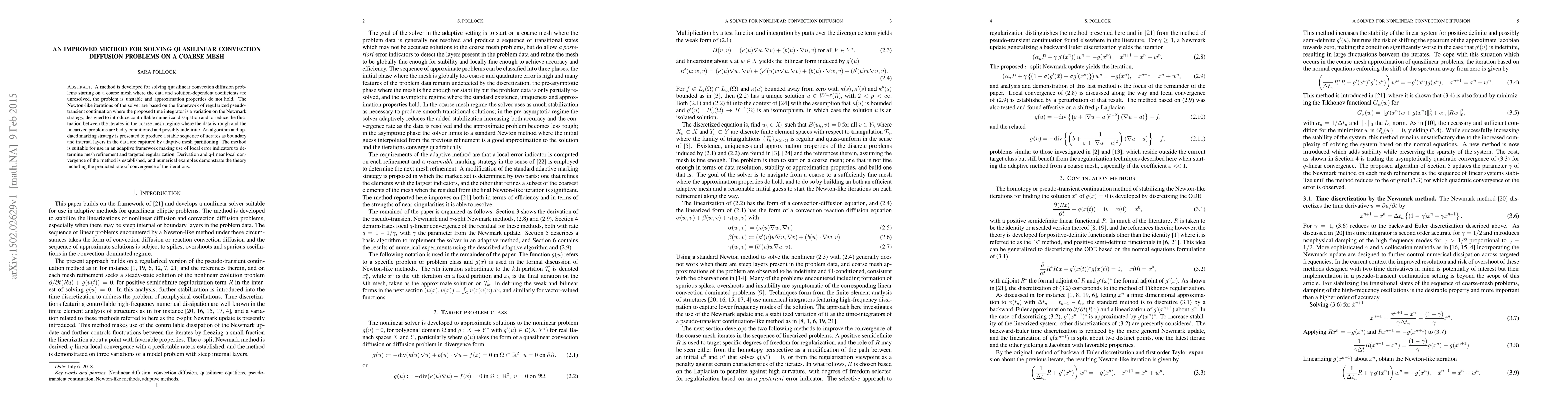 A method is developed for solving quasilinear convection diffusion problems starting on a coarse mesh where the data and solution-dependent coefficients are unresolved, the problem is unstable and approximation properties do not hold. The Newton-like iterations of the solver are based on the framework of regularized pseudo-transient continuation where the proposed time integrator is a variation on the Newmark strategy, designed to introduce controllable numerical dissipation and to reduce the fluctuation between the iterates in the coarse mesh regime where the data is rough and the linearized problems are badly conditioned and possibly indefinite. An algorithm and updated marking strategy is presented to produce a stable sequence of iterates as boundary and internal layers in the data are captured by adaptive mesh partitioning. The method is suitable for use in an adaptive framework making use of local error indicators to determine mesh refinement and targeted regularization. Derivation and q-linear local convergence of the method is established, and numerical examples demonstrate the theory including the predicted rate of convergence of the iterations.