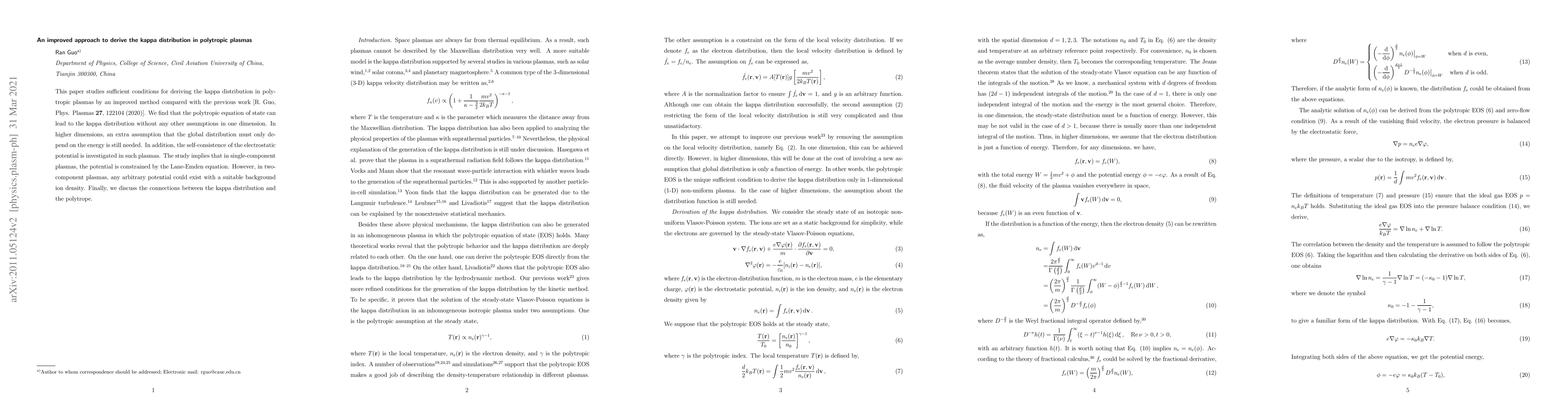 This paper proposes an improved method for deriving the kappa distribution in polytropic plasmas without additional assumptions in one dimension, while requiring an extra assumption in higher dimensions. It also investigates the self-consistency of electrostatic potentials, finding constraints in single-component plasmas but arbitrary potentials in two-component plasmas.