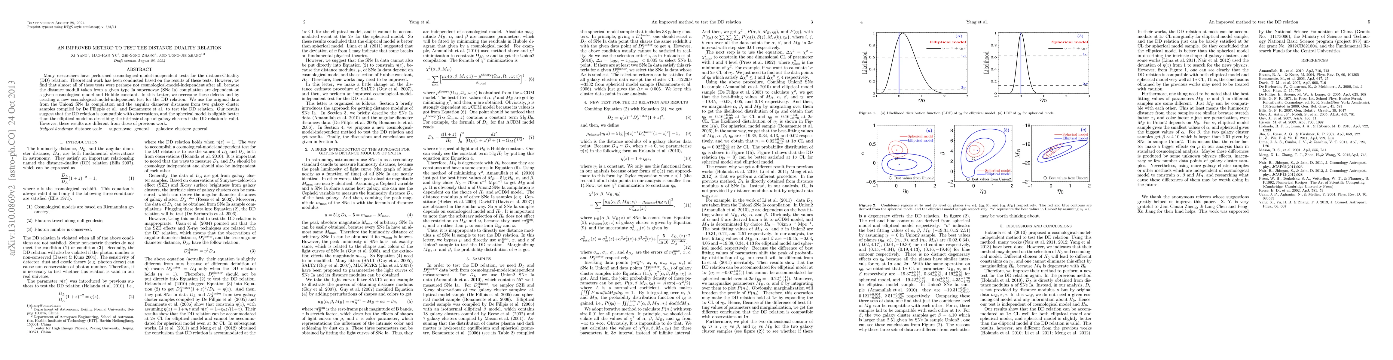 This paper presents a new cosmological-model-independent test for the distance-duality (DD) relation, finding that the DD relation is consistent with observations. The study uses data from supernovae and galaxy clusters, suggesting a preference for the spherical model over the elliptical model in describing galaxy clusters.