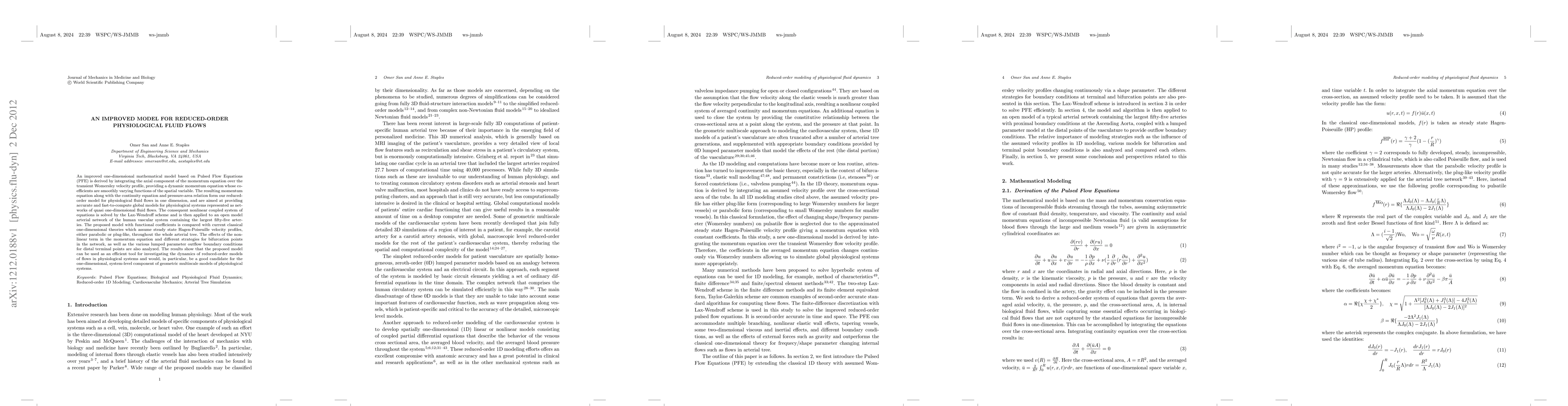 An improved one-dimensional mathematical model based on Pulsed Flow Equations (PFE) is derived by integrating the axial component of the momentum equation over the transient Womersley velocity profile, providing a dynamic momentum equation whose coefficients are smoothly varying functions of the spatial variable. The resulting momentum equation along with the continuity equation and pressure-area relation form our reduced-order model for physiological fluid flows in one dimension, and are aimed at providing accurate and fast-to-compute global models for physiological systems represented as networks of quasi one-dimensional fluid flows. The consequent nonlinear coupled system of equations is solved by the Lax-Wendroff scheme and is then applied to an open model arterial network of the human vascular system containing the largest fifty-five arteries. The proposed model with functional coefficients is compared with current classical one-dimensional theories which assume steady state Hagen-Poiseuille velocity profiles, either parabolic or plug-like, throughout the whole arterial tree. The effects of the nonlinear term in the momentum equation and different strategies for bifurcation points in the network, as well as the various lumped parameter outflow boundary conditions for distal terminal points are also analyzed. The results show that the proposed model can be used as an efficient tool for investigating the dynamics of reduced-order models of flows in physiological systems and would, in particular, be a good candidate for the one-dimensional, system-level component of geometric multiscale models of physiological systems.